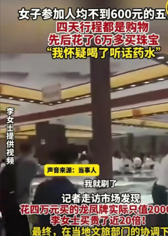 10月23日,北京一女子报了一个团,不到六百块钱玩五天,没想到五天有四天是买东西的,更让她奇怪的是,一个珠宝店的店员给她端来一杯水,她喝了之后,看了一块39,999元的珠宝,她还没说话呢,店员就说刷卡,女子就很听话地刷了卡,接下来她一共花了6万多元,事后女子怀疑自己喝了听话水了,要求退款。 据悉,李女士在网上看到一则旅游广告,不到600元的五日游行程,价格低得令人难以置信。 "太划算了!"李女士兴奋地告诉家人,"这个价格我们全家都能去!"抱着这样的心情,李女士一家满怀期待地踏上了旅程。 然而,现实很快给了她们当头一棒。五天的行程中,竟然有四天都在各种购物店里度过。第一天,导游带领大家参观了一家"土特产专卖店"。" 这里的东西可都是当地最有名的特产,错过可就没机会了!"导游热情洋溢地介绍着。李女士虽然觉得有些不对劲,但想着既然来了,买点特产也无妨。 第二天,行程安排到了一家玉石店。店内琳琅满目的玉器让人眼花缭乱。 导游介绍说:"这家店可是政府指定的正规玉石销售点,质量绝对有保证。"李女士和家人被各种美轮美奂的玉器吸引,不知不觉中就在这里消费了近万元。 第三天,又是一家珠宝店。这次的遭遇让李女士至今心有余悸。店员殷勤地端来一杯"上好的普洱茶",说是店里的待客之道。李女士礼貌地接过,喝了几口后,突然感到头脑昏沉,意识模糊。 "这条龙凤牌真是太适合您了!"店员的声音仿佛从很远的地方传来。李女士觉得自己似乎失去了判断力,仿佛被某种力量控制着。等她回过神来,才发现自己已经刷卡购买了一条价值4万元的龙凤牌。 "我当时就觉得不对劲,"李女士事后回忆道,"那杯茶喝下去后,我整个人都不太清醒,感觉被人操控了一样。"这一情况让李女士怀疑茶水中是否含有"听话水"或其他影响神志的物质。 第四天,又是另一家珠宝店。此时的李女士一家已经对这种"购物游"感到厌倦和警惕。然而,导游的态度却变得强硬起来:"这是旅行社安排的必去项目,不去的话会影响大家的行程。"无奈之下,李女士一家只好跟随大队进店,但这次他们坚决不再购物。 回到北京后,李女士开始清点这次旅行的花销,惊讶地发现仅购物一项就花费了超过6万元。更让她震惊的是,那条在珠宝店买的4万元龙凤牌,在其他店铺的售价竟然只有2000元左右!这巨大的价格差距让李女士意识到自己可能陷入了一个精心设计的"宰客"陷阱。 李女士立即联系了旅行社要求退款,但遭到了拒绝。无奈之下,她向当地文旅部门投诉。在相关部门的介入下,旅行社最终同意退还李女士的购物款。 这起事件引发了广泛讨论,许多网友纷纷表示同情和愤怒。 这位专家还建议游客在选择旅游产品时要格外谨慎:"价格过低的团队游往往存在隐性消费陷阱。建议消费者选择信誉良好的旅行社,仔细阅读合同条款,特别是关于购物安排的内容。同时,在旅途中也要保持警惕,不要轻易接受商家的赠饮,更不要在不清醒的状态下做出购买决定。" 李女士的经历给我们敲响了警钟。在追求实惠的同时,我们更应该保持理性和警惕。真正的旅行应该是放松身心、开阔眼界的愉快经历,而不是被迫进行的"购物马拉松"。 同时,我们也呼吁相关部门加强对旅游市场的监管,严厉打击欺诈和强制消费行为,为消费者营造一个诚信、透明的旅游环境。 旅游业作为服务行业,应该以游客的满意度为首要目标,而不是把游客当作"提款机"。只有真正尊重游客、提供优质服务,才能实现旅游业的长远健康发展。 让我们共同努力,还旅游以本来面目,让每一次出行都成为美好的回忆,而不是留下遗憾和懊悔。记住,一次愉快的旅行,不在于花了多少钱,而在于收获了多少快乐和见闻。下次出游,请擦亮双眼,选择真正适合自己的旅行方式,享受旅途的每一刻。 最后,我想说的是,旅行的意义在于放松身心、开阔视野,而不是被迫进行一场又一场的购物。希望每个人都能享受到真正的旅行乐趣,带着美好的回忆满载而归。让我们一起为构建诚信、透明的旅游市场贡献自己的力量,让旅游成为一种纯粹的享受,而不是陷阱与烦恼的代名词。(文中皆为化名)