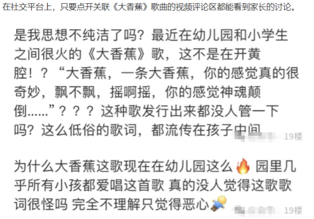 有一些家长呼吁让全社会共同关注,让“大香蕉”之类的歌曲彻底消失在孩子们的歌单里!