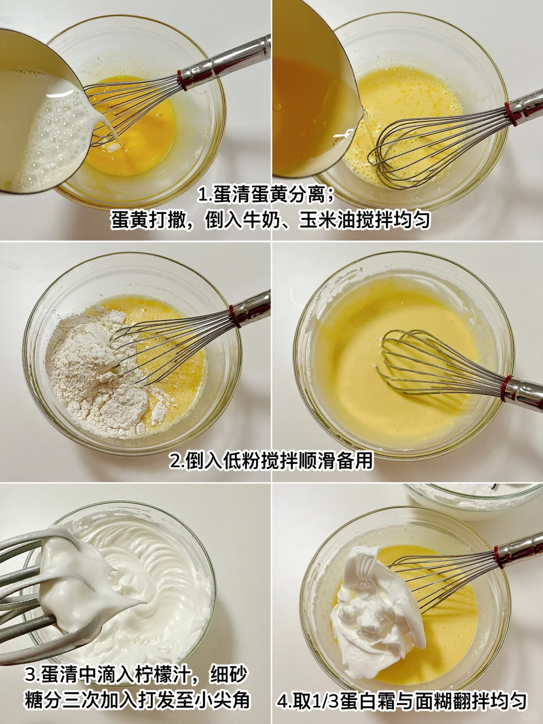 ① 分离🥚蛋清蛋黄,蛋黄打撒加牛奶和玉米油搅拌均匀
