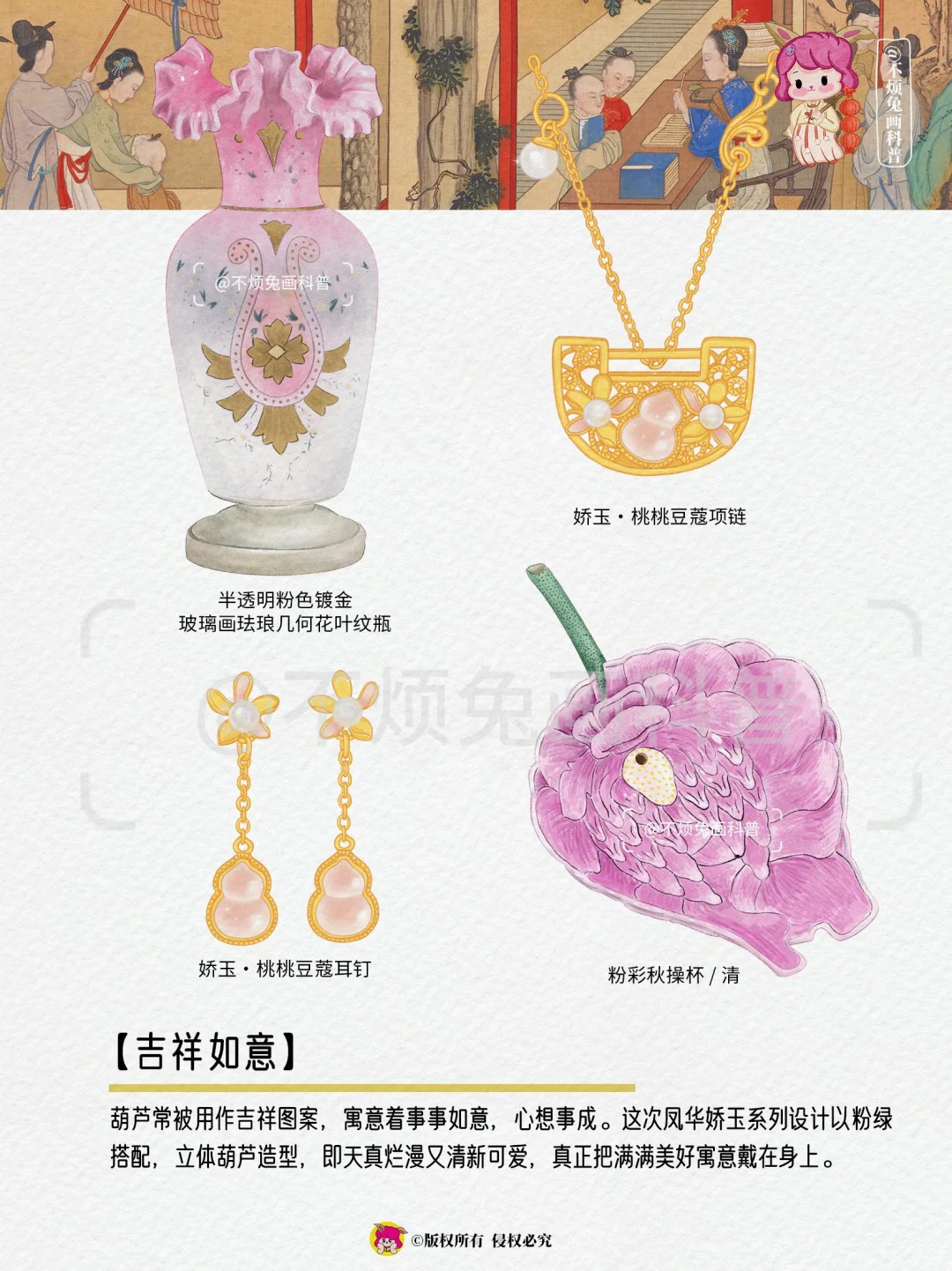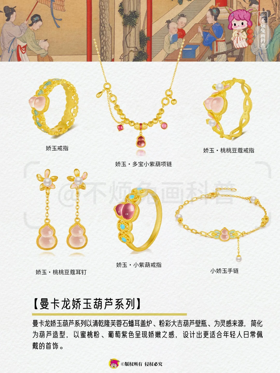 曼卡龙娇玉葫芦系列以清乾隆芙蓉石蟠耳盖炉、粉彩大吉葫芦壁瓶、为灵感来源,简化为葫芦造型,以蜜桃粉、葡萄紫色呈现娇嫩之感,设计出更适合年轻人日常佩戴的首饰。