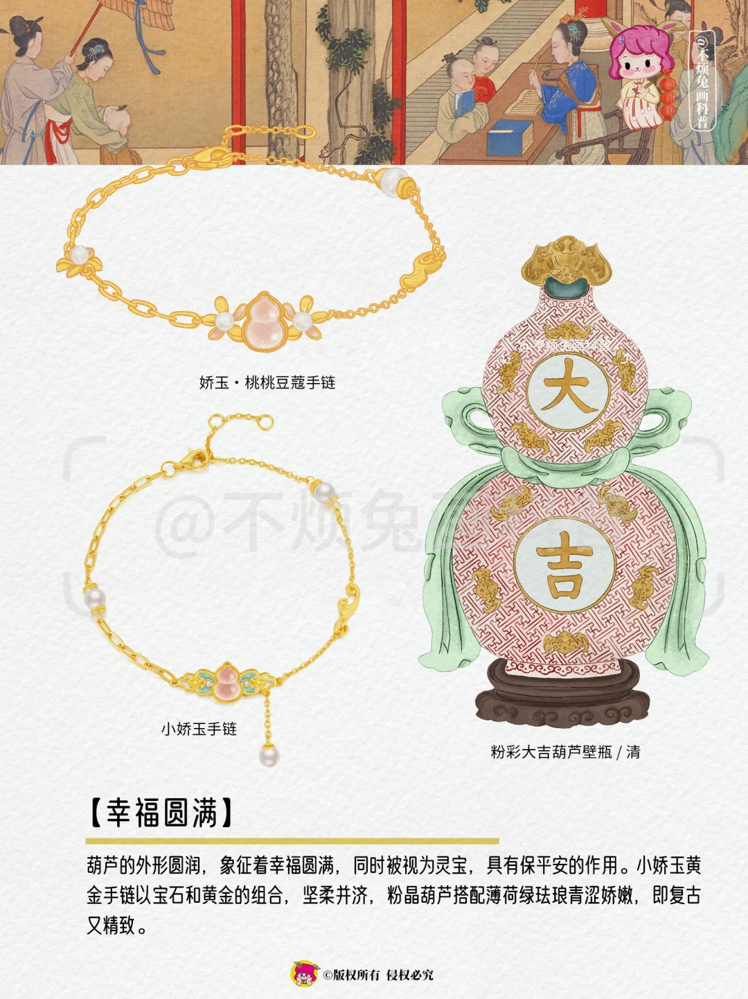 葫芦的外形圆润,象征着幸福圆满,同时被视为灵宝,具有保平安的作用。小娇玉黄金手链以宝石和黄金的组合,坚柔并济,粉晶葫芦搭配薄荷绿珐琅青涩娇嫩,即复古又精致。