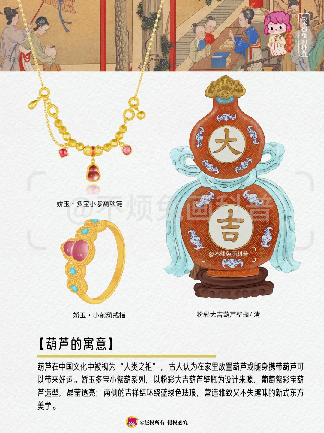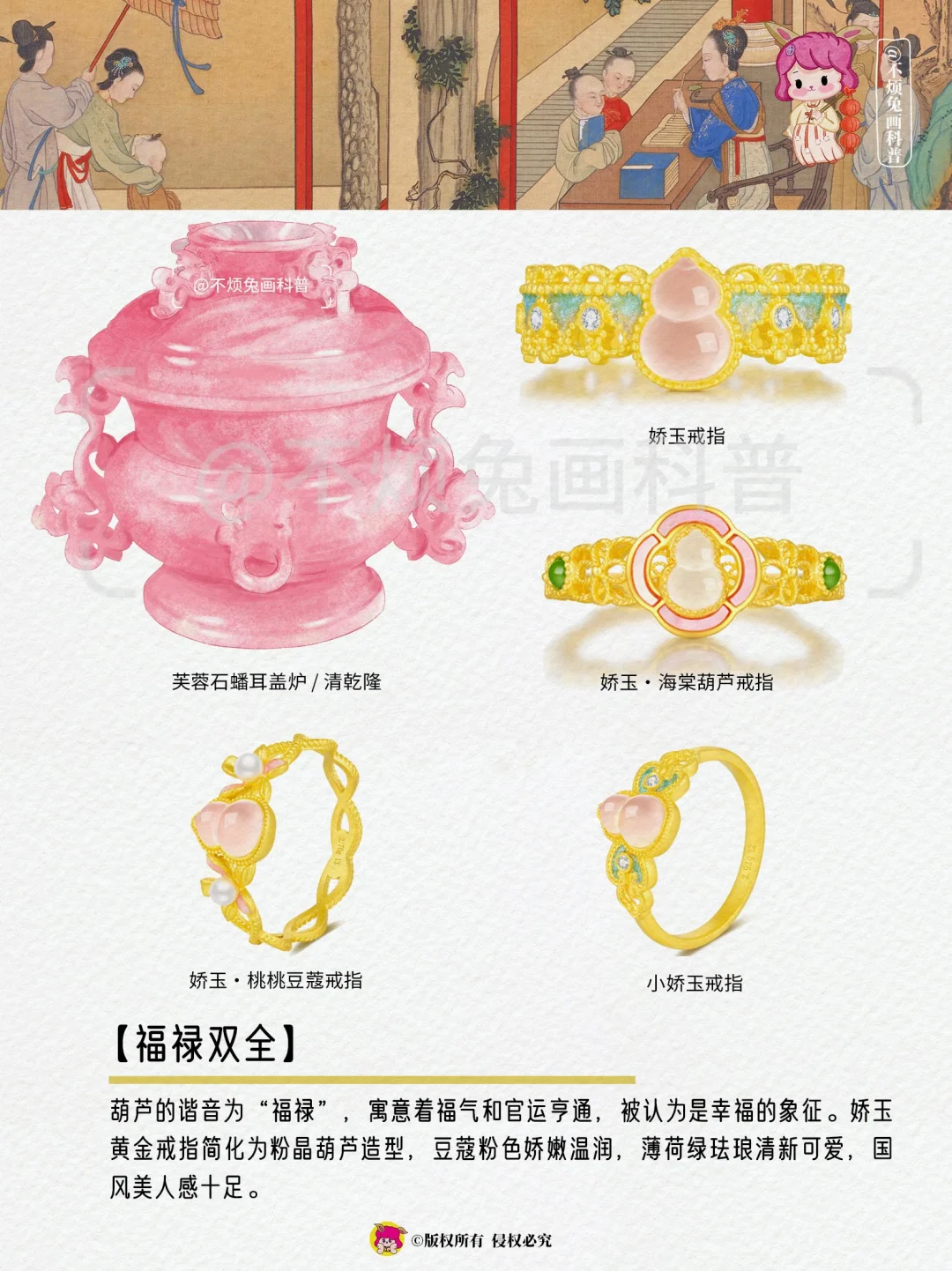 葫芦的谐音为“福禄”,寓意着福气和官运亨通,被认为是幸福的象征。娇玉黄金戒指简化为粉晶葫芦造型,豆蔻粉色娇嫩温润,薄荷绿珐琅清新可爱,国风美人感十足。
