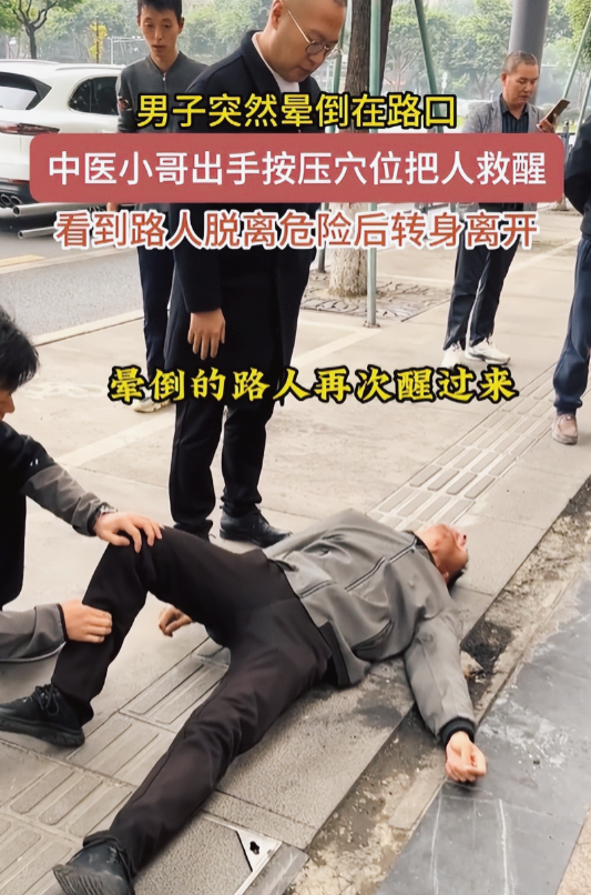 成都街头,人潮涌动,一个背包男突然栽倒了。周围人驻足观望,却无人敢上前。这时,一个学中医的小伙出现了。他立刻蹲下,给男子诊脉,接着按压他腿上的穴位。