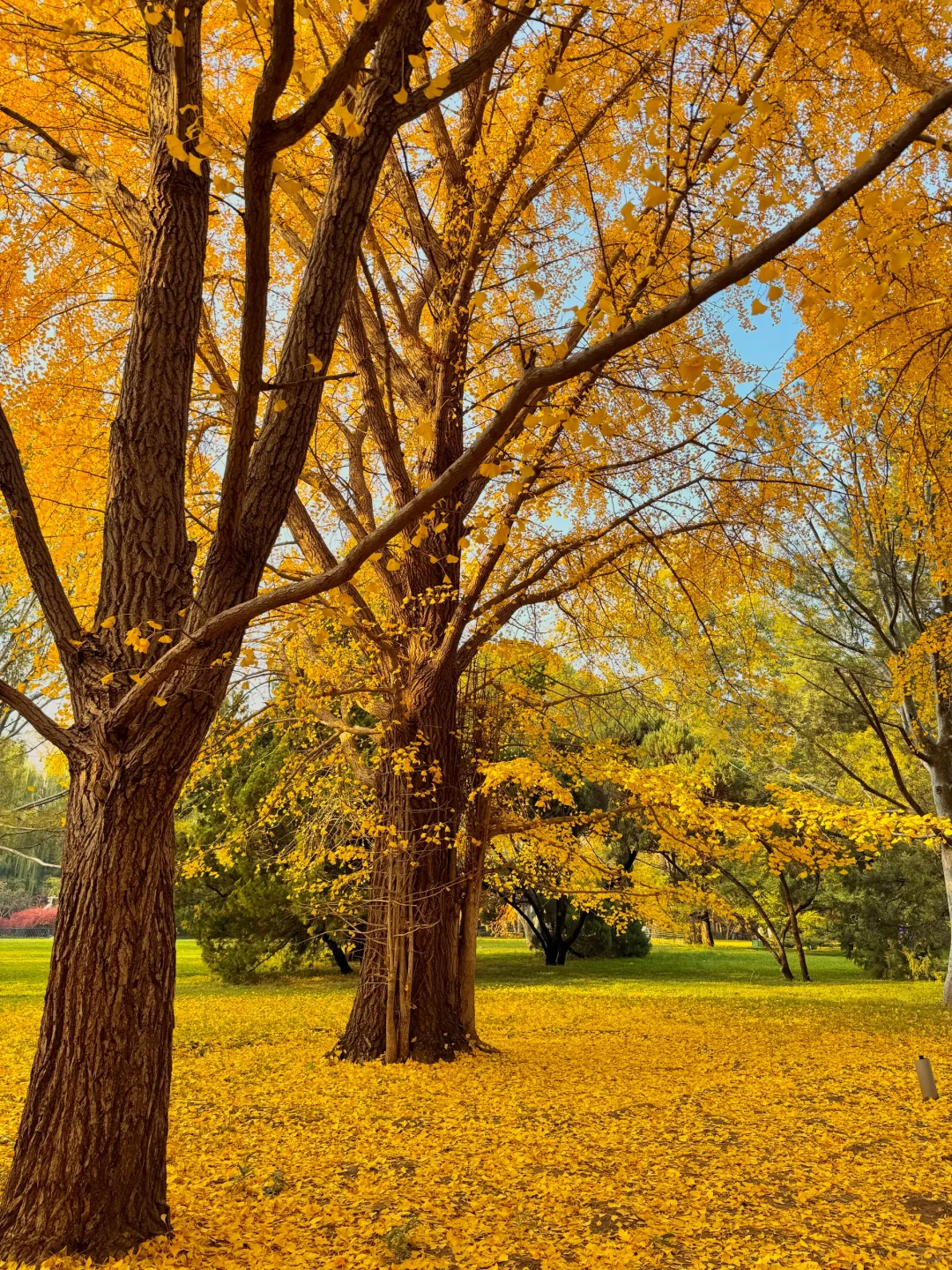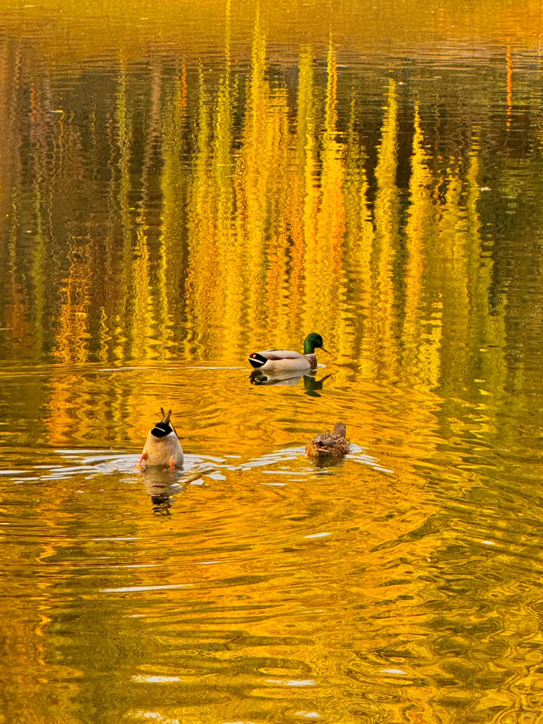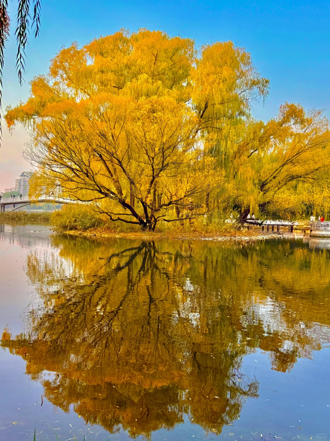 在这里拍到神树,目前还没完全黄,我有调色温,湖里面的小鸭子在树得倒影下太可爱了,还有路边也有棵超大的枫树,可以仰拍