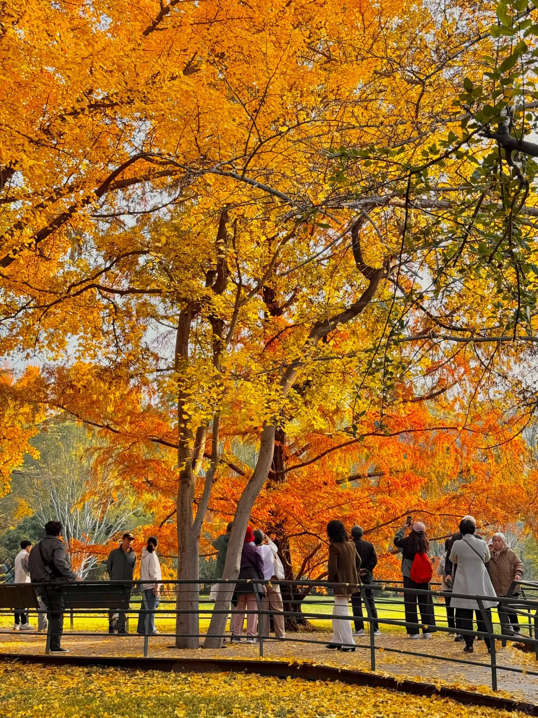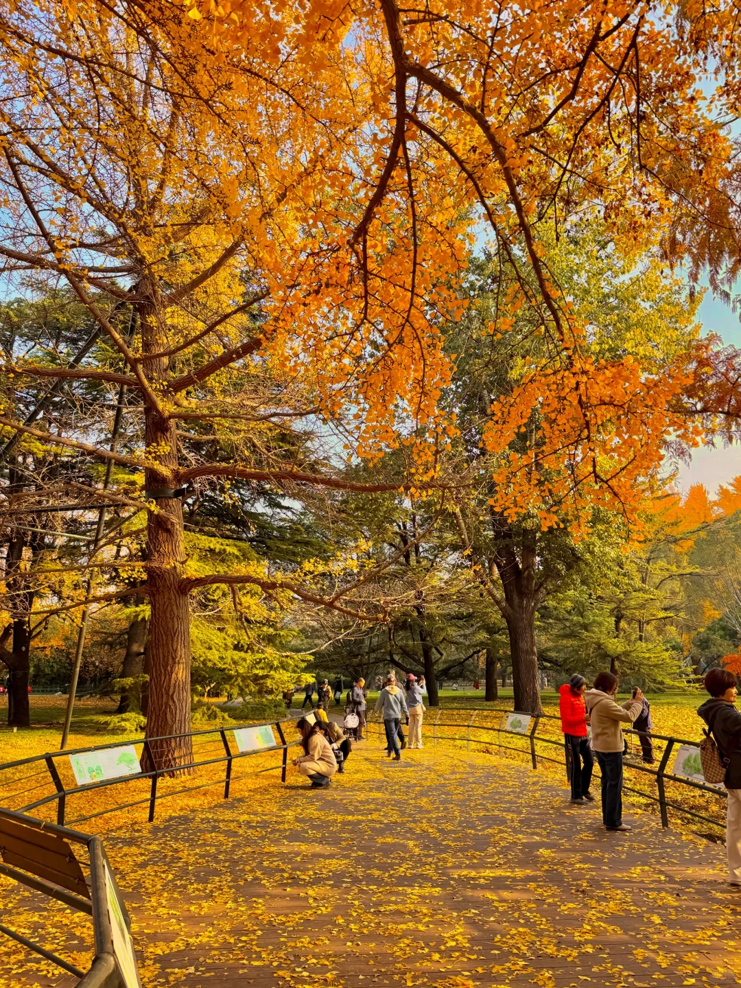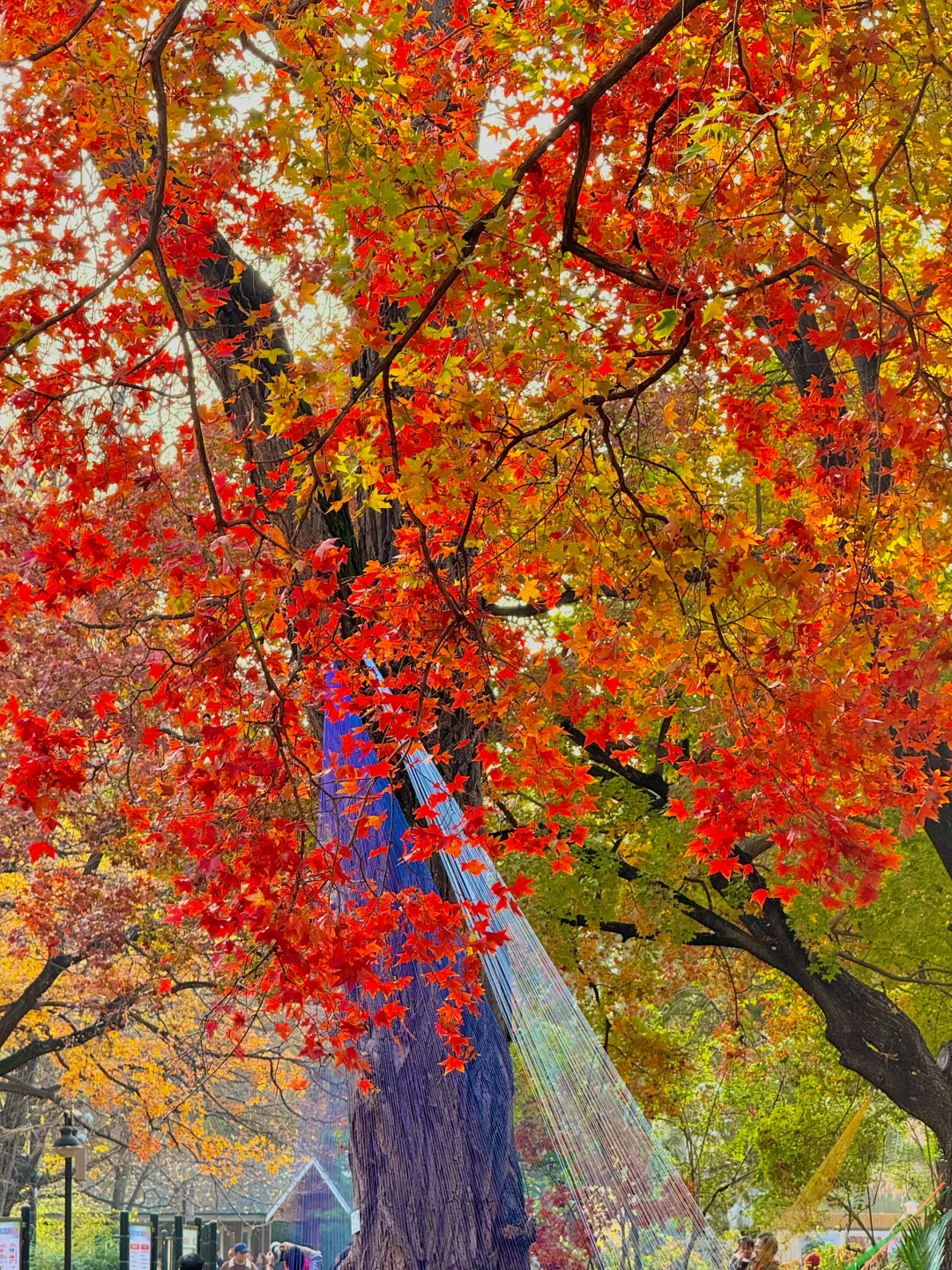 在这里拍到神树,目前还没完全黄,我有调色温,湖里面的小鸭子在树得倒影下太可爱了,还有路边也有棵超大的枫树,可以仰拍