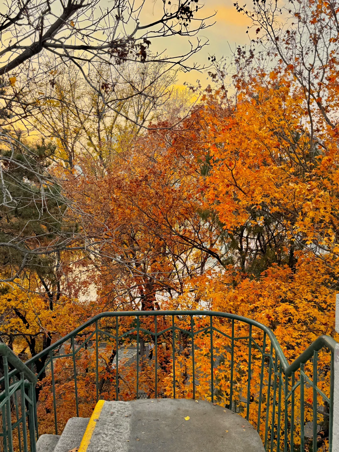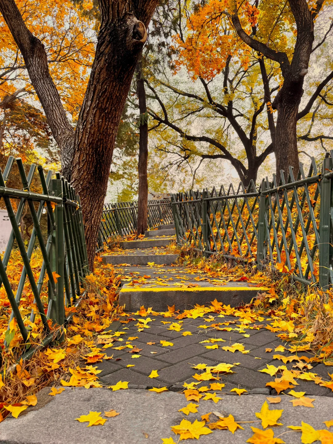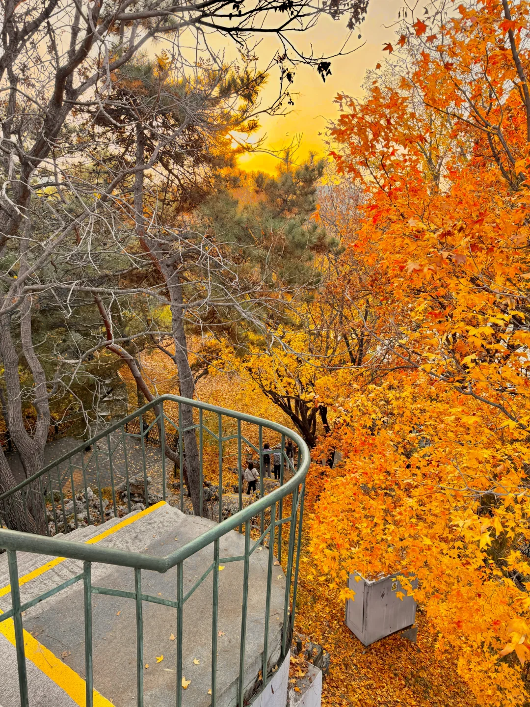 这里超美,我是穿过一片竹林发现的,在一座假山上,阶梯处正好和背后的枫叶🍁同以水平高度,俯拍场景空镜也不错