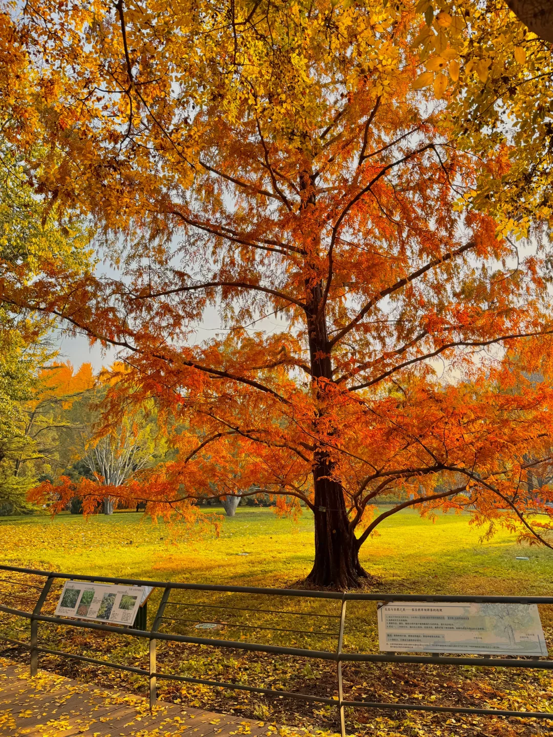 入门口不远就能看到超大银杏树,地下落了厚厚一层,旁边的红枫🍁也开始红了,顺着路右转可以看到草坪里一棵超大的水杉树