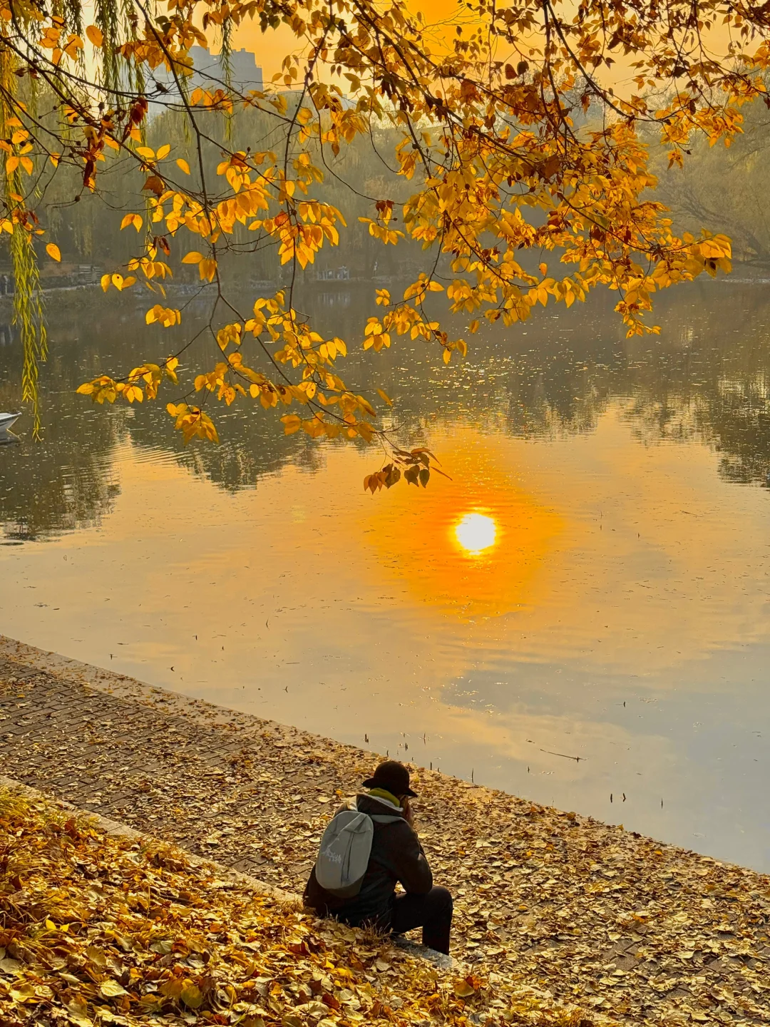 从南小湖往稻香村的湖边可以拍落日夕阳,画面上方是树叶下方是落叶,中间是洒满夕阳湖面🌇