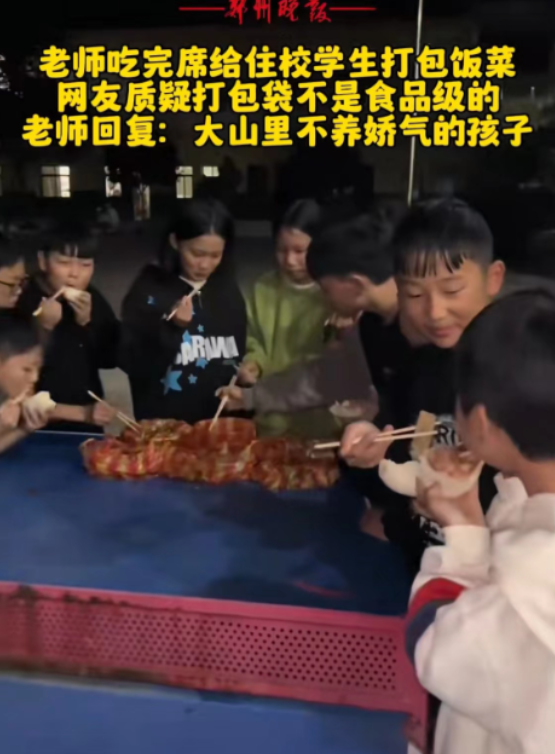 2023年10月河南一乡村女老师外出吃席,给住校学生用塑料袋打包饭菜,孩子们围站在乒乓球案边,开心满足的吃着,但有人却站出来,质疑塑料袋不健康。女老师平静回应:大山里不养娇气的孩子!