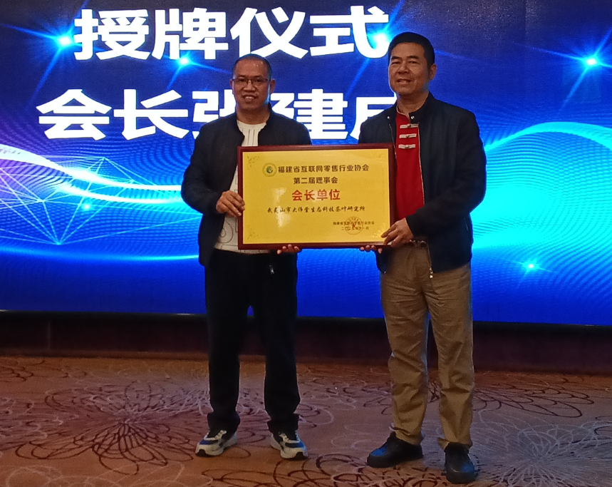 图为新任会长授牌仪式。 经与会代表无记名投票,大会选举产生了该会新一届理事会及监事会。随后,在该会第二届理事会第一次会议上,武夷山市大师堂生态科技茶叶研究所所长张建成正式当选为福建省互联网零售行业协会第二届理事会会长,黄新腾、刘贵长、王家铭、陈垚鑫当选副会长,肖文进当选监事长,周金铁当选秘书长。