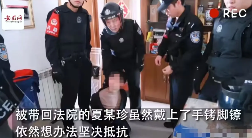 最后,确定夏某珍没有刀之后,一群法警一拥而上,将夏某珍戴上了手铐脚镣。
