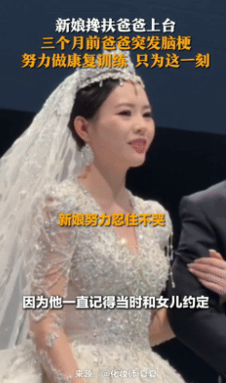 11月11日,女儿婚前3个月,父亲突发脑梗陷入瘫痪!为了不让女儿留下遗憾,父亲开始拼命复健,就在2天前的婚礼上,“奇迹”发生了!网友:祝你的父亲长寿,也祝我的父亲长寿! 三个月前,新娘的父亲突然因急性脑梗倒下,被紧急送入重症监护室。那一刻,原本喜气洋洋的家庭瞬间陷入了恐慌和担忧中。 医生的诊断如同晴天霹雳,父亲的生命岌岌可危。然而,即便在生死边缘,父亲的心中始终牵挂着女儿即将到来的婚礼。 经过医护人员的全力抢救,父亲最终保住了性命,但却因脑梗后遗症导致瘫痪在床。 医生委婉地告知家人,康复之路将会异常艰难,甚至可能终生无法站立。面对这样的诊断,全家人都陷入了深深的沮丧之中。 然而,父亲的内心却燃起了一个坚定的信念。他回想起女儿成长的点点滴滴,从她蹒跚学步时自己搀扶她的双手,到送她第一天上学时她依依不舍的眼神,再到如今她即将步入婚姻的殿堂。 这些美好的回忆激发了父亲内心深处的力量,他暗自下定决心,一定要在女儿的婚礼上站起来,将她的手亲自交到新郎手中。 从那一刻起,父亲开始了艰苦卓绝的复健之路。每一天,他都要承受着难以想象的痛苦。肌肉的拉伸犹如千刀万剐,每一个动作都让他汗如雨下。 然而,父亲咬紧牙关,从未放弃。即便在深夜,当所有人都已入睡,他也会偷偷地尝试活动自己僵硬的四肢,哪怕只能移动一厘米,也会让他欣喜若狂。 复健的过程充满了挫折和失败。无数次,父亲在尝试站立时摔倒在地,但他总是默默地爬起来,继续尝试。他的坚持感动了所有的家人。 妻子每天细心地照料他的饮食起居,女儿则在百忙之中抽出时间陪伴父亲,给予他鼓励和支持。看到父亲如此努力,家人们心中既心疼又敬佩,他们知道,父亲所做的一切,都是为了那个重要的时刻。 随着婚期的临近,父亲的身体状况虽有好转,但距离能够站立行走还有很大差距。家人们准备了轮椅,以防父亲无法如愿以偿。 然而,父亲心中仍然怀着希望,他坚信奇迹会发生。女儿看着父亲的坚持,心中既期待又担忧,她希望父亲能实现愿望,但更不愿看到他因此受伤。 终于,婚礼的这一天来临了。当新娘站在化妆镜前,看着自己一身洁白的婚纱,内心不禁有些忐忑。她不知道父亲能否如愿以偿地站起来,但她知道,无论如何,父亲的爱都已经深深地印在了她的心里。 婚礼进行曲响起,宾客们的目光都聚集在礼堂的入口处。在所有人的注视下,一个令人惊讶的画面出现了。 只见新娘的父亲,在家人的搀扶下,正一步一步地向前走来。他的动作虽然缓慢而艰难,但每一步都充满了坚定和力量。全场的宾客都屏住了呼吸,注视着这个令人动容的场景。 父亲的每一步都像是一次巨大的挑战。 他的额头上渗出了细密的汗珠,面容因努力而显得有些扭曲,但眼神中却闪烁着坚毅的光芒。他一步一步地向女儿走去,仿佛这短短的距离就是他这三个月来所有努力的凝聚。 当父亲终于走到女儿面前时,整个礼堂都陷入了一片寂静。他颤抖着伸出手,小心翼翼地握住了女儿的手。 在这一刻,父女俩的眼中都噙满了泪水。父亲缓缓地将女儿的手放入新郎的手心,这个简单的动作承载了太多的爱与祝福。 这一刻,全场的宾客都被深深地触动了。许多人不禁落下了感动的泪水。他们见证了一个父亲为女儿付出的巨大努力,也见证了一份深沉而伟大的父爱。这种爱虽然不像母爱那样细腻周到,但在关键时刻却显得如此厚重而坚定。 婚礼结束后,这个感人的故事很快在网上传开。无数网友被父亲的行为所感动,纷纷留言表达自己的感受。有人说,这让他想起了自己已经离世的父亲,心中充满了思念和遗憾。 还有人表示,这个画面让他想起了歌曲《父亲》中描述的场景,父亲将女儿的手交到女婿手中的那一刻,仿佛就是歌词的真实写照。 这场婚礼不仅仅是新人的重要时刻,更是一个家庭爱的见证,一个父亲用行动诠释了什么是真正的父爱。它让我们看到了人性最美好的一面,也让我们对生活充满了希望。无论未来会遇到什么样的困难,我们都应该记住这个故事,记住爱的力量,勇敢地面对每一个挑战。
