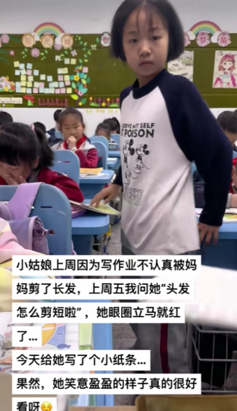 江苏的一个小姑娘因为写作业不认真,妈妈一生气就把孩子的头发剪了,第二天上学老师看到问了一句,谁知道孩子一听,眼睛立马就红了。