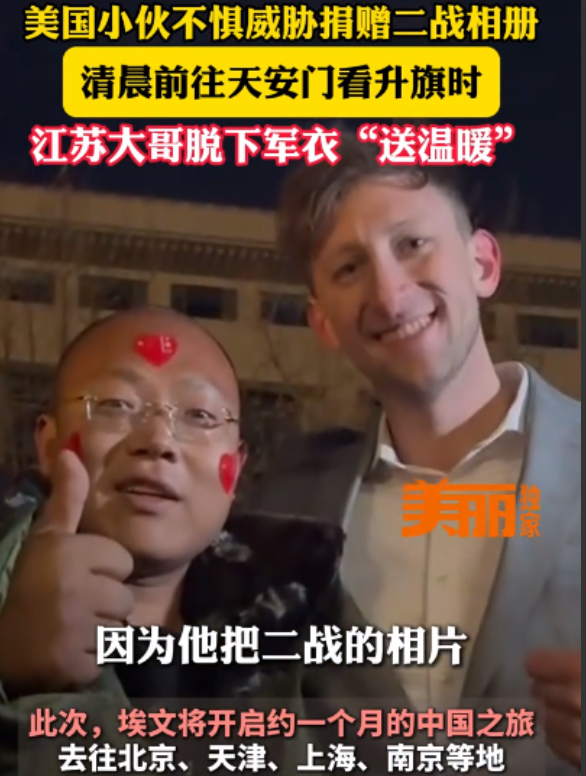 北京这几天温度确实低,最低已经到零下了,埃文可能忽略了天气,只穿了西装,肯定是冷的,被冻得瑟瑟发抖,在得到军大衣后,瞬间就温暖了,他也表示,军大衣是见过最酷的外套!