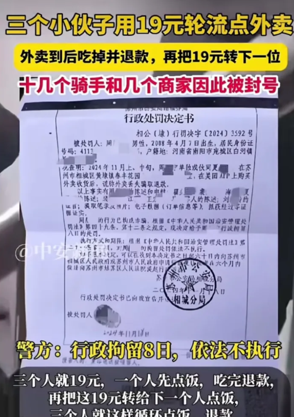 这三位05后的小伙伴们轮流点外卖,每次外卖送到后,他们便分着享用,然后迅速申请退款。