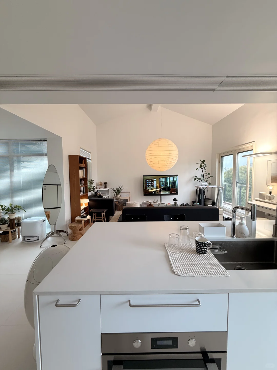 很多人问我们家层高,客厅尖顶位置4.5m左右,厨房和餐厅很低矮(这里原本是储藏间),现在的高度就2.3m不到