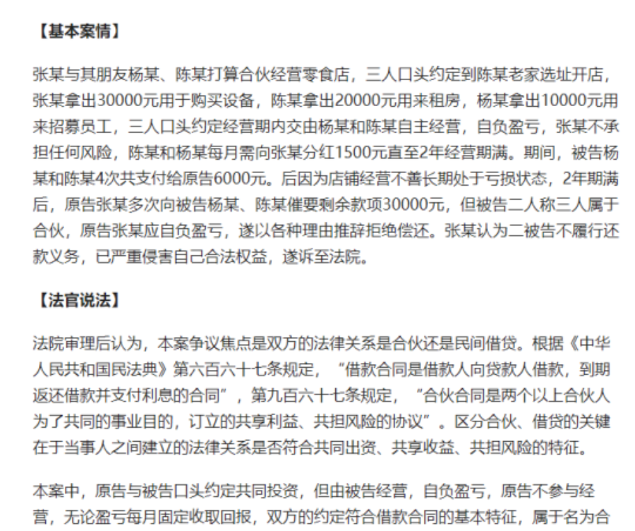 2024年8月,陕西一男子,邀请朋友一起开零食店,还说赚了大家分,赔了算我的。朋友拿了30000元给男子,男子承诺每月分红1500给朋友,可男子只给了4次就不给了,之后更是把店铺给关了。朋友多次找到男子,要求男子返还30000元借款,可男子却说这是投资款,已经全部亏损了,不用还。朋友将男子告上法庭,法院判决亮了。 2024年8月,陕西男子李洋怀揣着创业的梦想,决定邀请好友张显亮一起开设一家零食店。两人一拍即合,李洋更是豪迈地承诺:“赚了大家分,赔了算我的。” 张显亮被这份豪情打动,决定出资30000元,而李洋则出资20000元。然而,这场看似美好的合作,却在短短数月后演变为一场法律纠纷。 在决定开店之前,李洋和张显亮多次聚在一起,讨论着店铺的选址、装修、进货渠道等细节。他们跑遍了整个市区,最终选定了一处人流量较大的商业街作为店铺地址。 两人对未来的零食店充满了憧憬,李洋更是信心满满地表示,凭借他们的努力和独特的经营策略,店铺一定会生意兴隆。 装修期间,两人几乎每天都到现场监督进度,确保每一处细节都符合他们的期望。 进货时,他们亲自前往批发市场,挑选性价比高的商品。那段时间,他们几乎把所有的精力都投入到了这家零食店上,期待着开业后的美好时光。 经过一个多月的筹备,零食店终于开业了。开业初期,店铺的生意异常火爆,每天都有络绎不绝的顾客前来购买。 李洋和张显亮每天都忙得不亦乐乎,但他们的心里却是满满的喜悦和成就感。按照之前的约定,李洋每月固定向张显亮分红1500元,连续四个月,张显亮共收到了6000元的分红。 然而,好景不长,随着周边竞争对手的增多和顾客消费习惯的变化,店铺的生意逐渐冷清下来。李洋尝试了各种促销手段,但效果不佳。 面对日益严峻的经营形势,李洋开始感到焦虑不安。他试图通过调整商品结构、优化服务等方式来扭转局面,但一切努力似乎都徒劳无功。 最终,在连续亏损数月后,李洋无奈地做出了关闭店铺的决定。他将这个消息告诉了张显亮,张显亮听后感到十分震惊和失望。 他原本以为,凭借李洋的能力和他们的努力,店铺一定能够度过难关。然而,现实却给了他沉重的一击。 在收到前几个月的分红时,张显亮感到十分高兴和满足。他觉得自己没有白白投入这笔钱,李洋的承诺正在逐步兑现。 然而,随着店铺生意的下滑,他逐渐意识到情况可能并不乐观。他开始担心自己的投资是否能够收回,但每次向李洋询问时,李洋总是安慰他不要担心,表示会想办法解决。 然而,当李洋告诉他店铺已经关闭时,张显亮感到十分愤怒和失望。他要求李洋返还他的30000元借款,但李洋却表示这是投资款,已经亏损了无法返还。 两人因此产生了激烈的争执,原本亲密无间的朋友关系瞬间变得紧张起来。 李洋在关闭店铺后也经历了巨大的心理变化。从最初的自信满满到后来的焦虑不安,再到最终做出关闭店铺的决定,他经历了无数的挣扎和痛苦。 他深知自己辜负了张显亮的期望和信任,但面对现实的无奈和困境,他也不知道该如何是好。 在多次协商无果后,张显亮决定通过法律途径来维护自己的权益。他向法院提起诉讼,要求李洋返还他的30000元借款并支付利息。在庭审过程中,双方就案件的性质产生了激烈的辩论。 张显亮认为,他们之间实际上是借贷关系,而非合伙关系。 他提供了李洋每月固定向他分红1500元的证据,并指出李洋在关闭店铺后拒绝返还借款的行为已经构成了违约。他要求法院依法判决李洋返还借款并支付利息。 而李洋则坚持认为他们之间是合伙关系。 他提供了双方共同出资开设店铺的证据,并指出在经营过程中他们共同承担了风险和责任。他认为张显亮的投资款已经亏损了无法返还,因此不应该承担还款责任。 在庭审过程中,法院对双方提供的证据进行了仔细审查和分析。最终,法院认定双方之间实际上构成的是借贷关系而非合伙关系。 法院认为,虽然双方共同出资开设店铺,但李洋承诺每月固定向张显亮分红的行为已经符合了借贷关系的特征。同时,李洋在关闭店铺后拒绝返还借款的行为也构成了违约。 根据《民法典》的相关规定,法院最终判决李洋应偿还张显亮的30000元借款及利息。 利息按银行同期贷款利率的四倍计算,扣除李洋已经支付的6000元分红后,李洋还需支付2280元利息。最终,李洋需支付张显亮共计32280元。 这场法律纠纷的解决不仅为双方提供了一个公正和合理的解决方案,也为广大创业者提供了一个有益的警示和借鉴。在商业合作中,双方应该明确约定各自的权利和义务,并签订书面合同以确保双方的权益得到保障。同时,在合作过程中双方也应该保持沟通和协商,共同应对各种风险和挑战。 (来源:城固县人民法院)