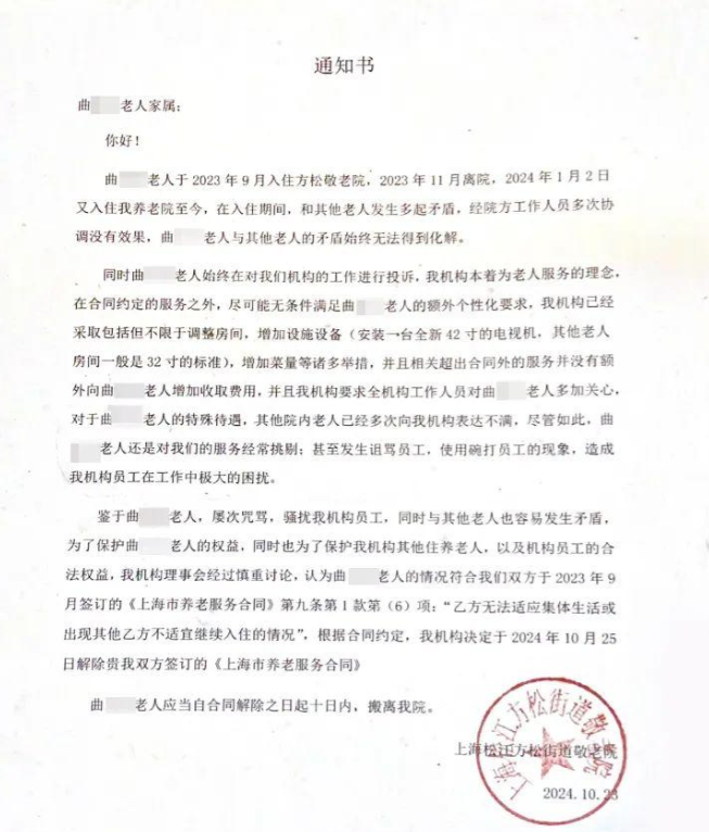 经过多次沟通后,敬老院终于决定做出艰难的决定——单方面解除与曲女士签订的养老服务合同。