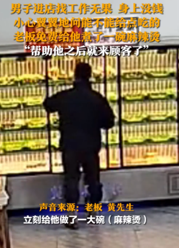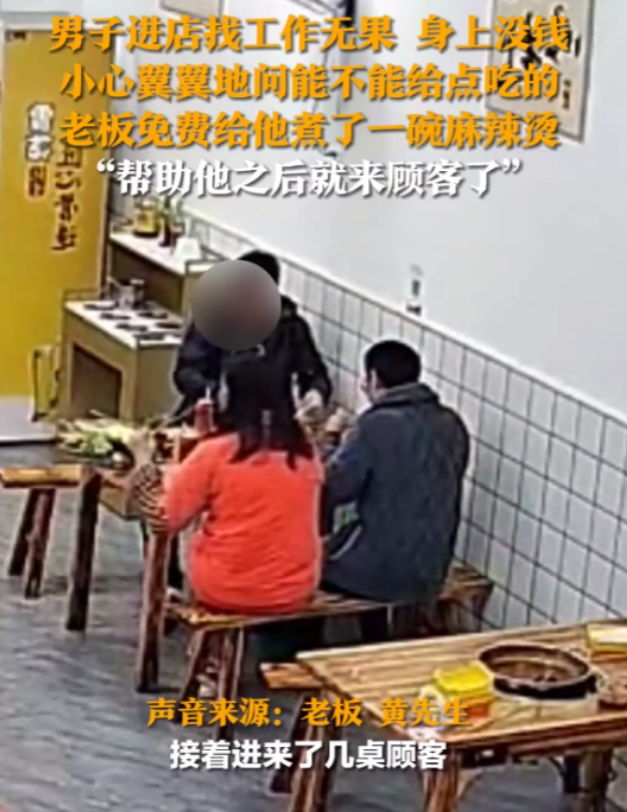 “看哭了!”湖南怀化,一饭店生意不好,直到9点还没客人!然而,一男子却来店里找工作,还问能不能免费吃顿饭?老板好心答应,给他煮了一碗麻辣烫,不料下一秒,神奇的一幕发生了!网友:应了那句话你只管善良,福报在路上。 店里的生意越来越不行了,店主刘先生看着空荡荡的屋子苦涩不已,今天一天都没开张了。 大环境不景气,各行各业都会受到影响,即便店里生意不好,算下来也比打工稍微好点,刘先生也就没想着转行。 晚上9点,刘先生都打算关门下班了,店门口却迎来了一位意外的客人。 只见这位客人面带局促,走路都有些小心翼翼的,刘先生也没多想,就连忙迎了上去,还没等刘先生开口说话,客人就试探着先开口了:“老板,你这里招工吗,厨师、服务员都行。” 刘先生稍微愣了一下,便婉言拒绝了,店里现在只能稍微盈利,再雇人的话肯定是赔本的。 客人听到这话,不好意思地笑了笑,然后表示:自己一天没有吃饭了,能不能在你家免费吃顿饭。 刘先生一听连忙表示没问题,说着让客人先坐,他去做饭了。 经过短暂的交谈,刘先生觉察到了客人的窘境,便为他做了一大碗麻辣烫,让他饱餐一顿。饭刚端上来,客人便准备狼吞虎咽,刘先生见状连忙提醒:饭热,慢点吃。 刘先生慢慢了解到,客人王先生失业一段时间了,一直也没能找到合适的工作,每天就在城市里这么找寻着,但一直不如人意。 今天晚上,他实在饿得不行了,便抱着试试的态度看招不招工,或者免费饱餐一顿。 听到这些,刘先生一时也感慨不已,但仍给他鼓劲:环境不好,什么也不好做,再坚持坚持,低谷期嘛,总会过去的。 同是天涯沦落人,相逢何必曾相识,就在两人热切交谈之际,店里又来了三四位客人,刘先生连忙起身招呼。 刘先生刚把几位的麻辣烫端上桌,没想到店里又接着来了七八位客人,这下刘先生开始忙碌了起来,但就在忙碌的过程中,已经一天没动静的外卖提示音,也接着提示了五六次。 店里的客人,加上外卖单子,这下把刘先生给忙的。 而王先生吃完饭后,看到忙碌的刘先生也开始主动帮忙招呼着,最后等到店里客人都吃完了,王先生向老板再次道谢之后,便离开了。 这边刘先生想当今天的特别经历,便发布到了网上。 评论区中好评如潮,有人为刘先生点赞,也有人表示有过同样的经历,而有一条特别的评论是这样写的: “但行好事,莫问前程,只管善良,福报在路上。” 【信息来源:男子进店找工作无果 身上没钱 小心翼翼地问能不能给点吃的 老板免费给他煮了一碗麻辣烫 “帮助他之后就来顾客了”2024-11-24 15:27·生活帮】