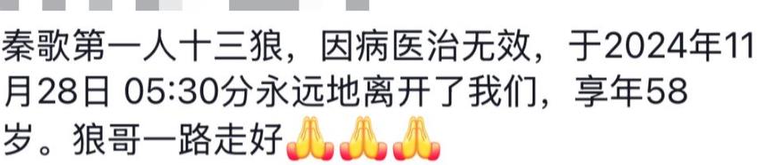 58岁“秦歌第一人”十三狼去世。 十三狼的秦歌唱的太好啦!百听不厌。 走的太突然、太可惜、太让人痛心!沉痛哀悼、一路走好! 一个不错的艺人,一个一直在宣传陕西文化的冷娃,走的有些早呀,愿你走好!