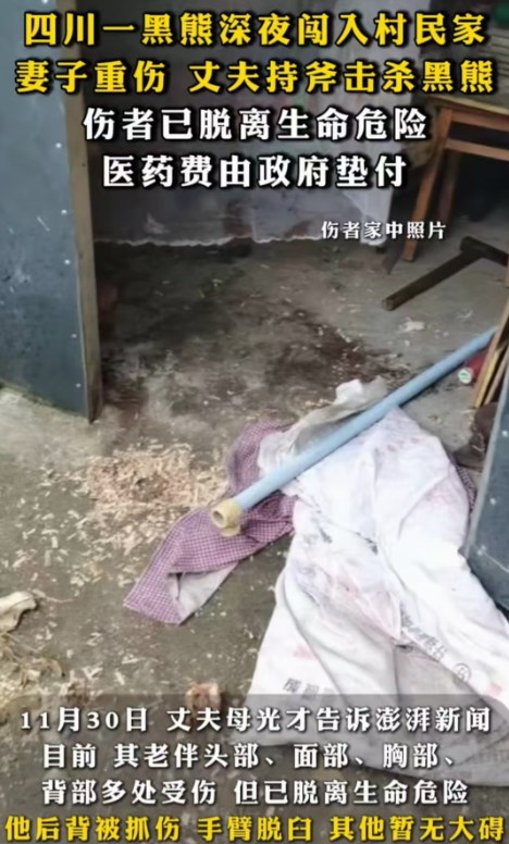 四川,绵阳。女子听见家里狗叫开门查看被黑熊扑倒,丈夫听见妻子呼救冲出来和黑熊搏斗在一起,随后用斧头将黑熊劈死。网友:摊上事了,杀死保护动物最少判十年!