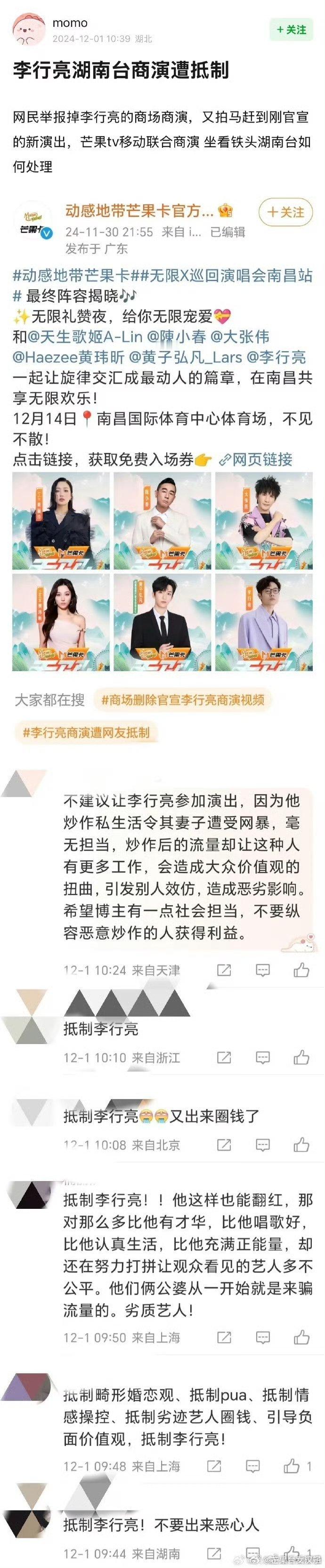 李行亮商演再次遭抵制 ,为啥抵触他啊不该是他老婆嘛[衰]他不是无受害者嘛[喵喵]
