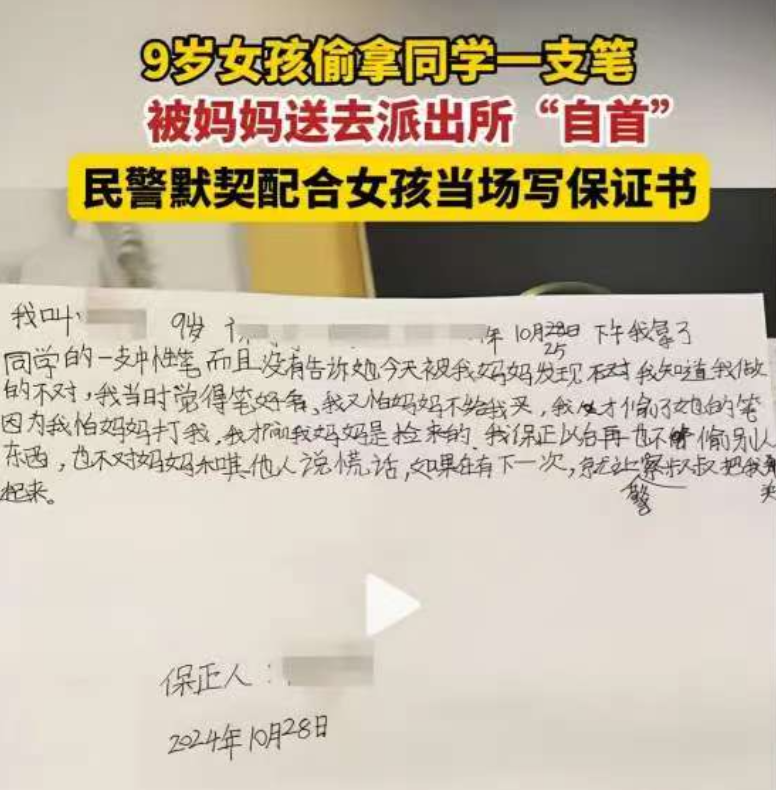 这个派出所火了,10月25日9岁女孩偷了同学一支笔,妈妈知道后拖着她到派出所“自首”。在没有提前商量的情况下,警察叔叔居然和女孩妈妈神配合,而女孩写下的保证书更是把网友看乐了。 这天一民警正在值班,派出所突然进来一对母女,女孩大概十几岁的模样,神色有些慌张,母亲倒是一脸淡定,警察没有搞懂这对母女是何意图。 突然母亲开口道:“你问问警察叔叔,偷东西是不是要坐牢”,说完这句话还向他使了一个眼色。 警察立马心领神会,就着这位母亲刚才的话说“你妈妈说得对,偷东西就是要被关起来,你不能去上学,也见不到父母和朋友了。” 这时母亲朝女儿看了一眼,一副看我没骗你吧的样子。 女孩听到警察的话也立马慌了神,紧张地快要哭了出来,立马交代了所有“犯罪事实”。 原来,她看到自己的同学有一支很漂亮的笔,笔上面印制的图案非常精美,这让很多同学都非常羡慕,其中就包括女孩,但拥有这支笔的同学对她很爱惜,拒不外借,而且也很少拿出来使用。 这让女孩对这支笔更加地好奇了,一天放学后因为女孩中途被老师叫去了办公室,所以等她回到教室时,同学们几乎都走光了,她突然看见那只笔就明晃晃地躺在同学的桌子上,应该是走得太急忘记哪了,女孩心想。 但脚步却不由自主地朝着同学的座位的方向走去,女孩发现在夕阳下,那只笔的周围像是被镀了一圈金光,显得更加耀眼了。
