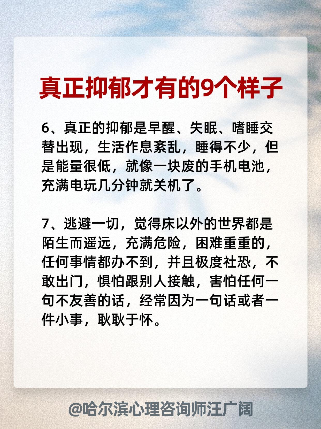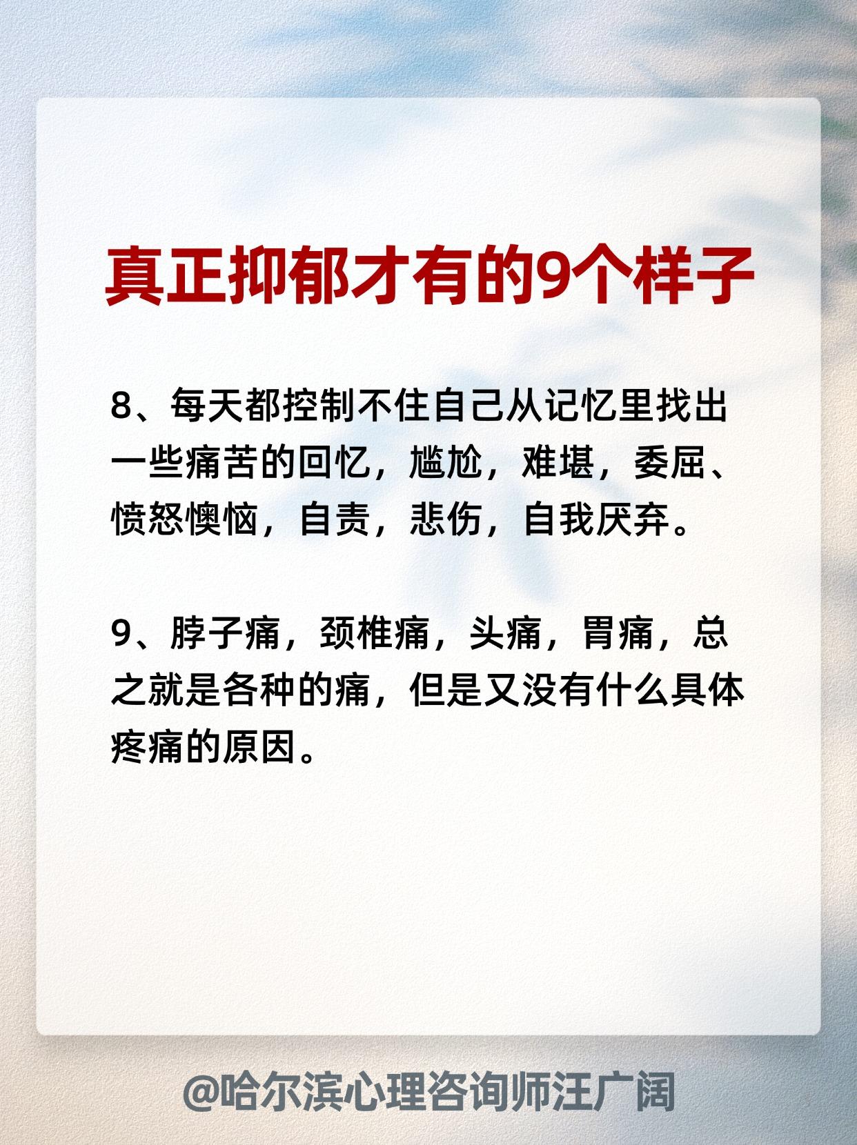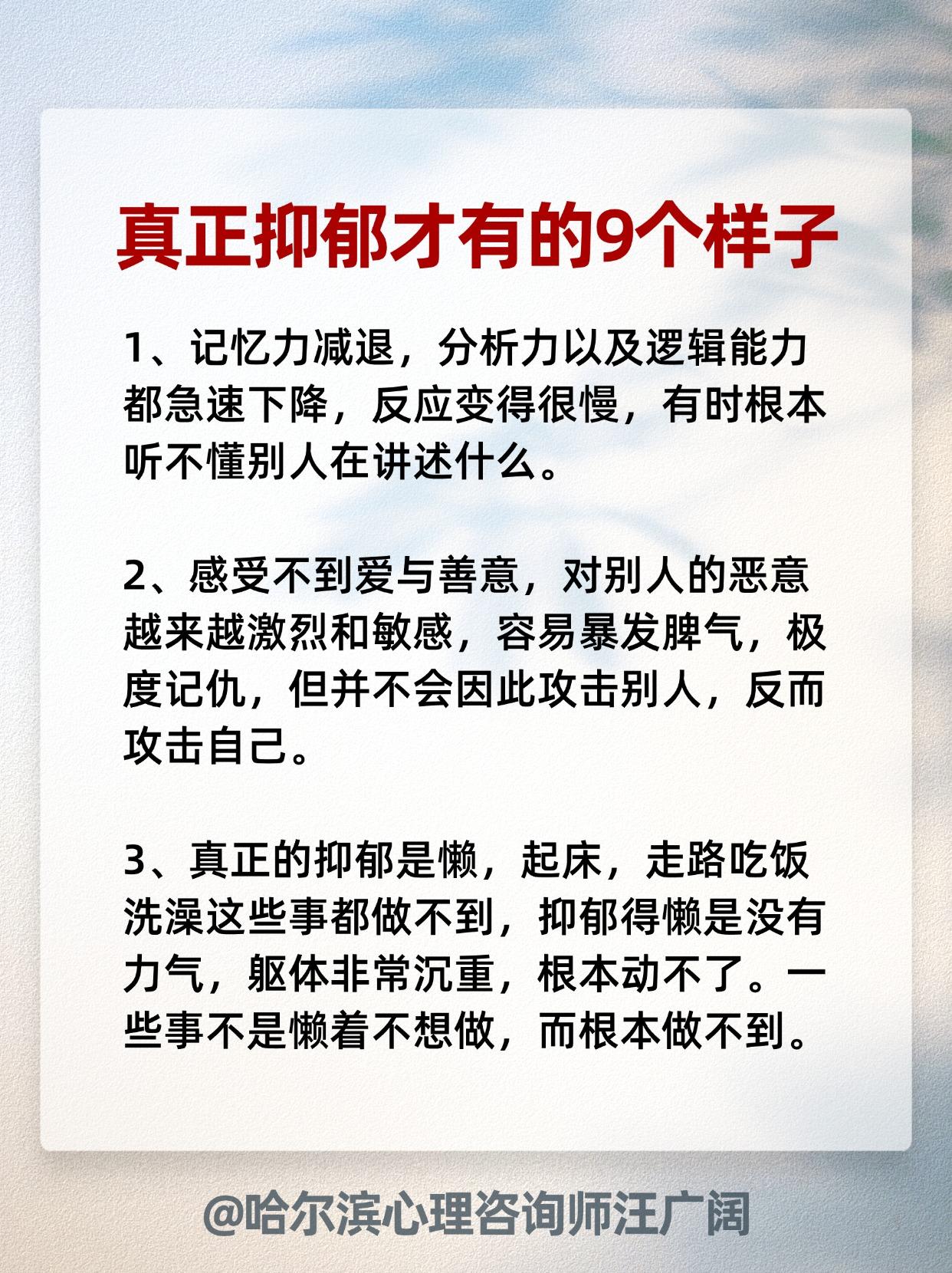 始然 38 2024-12-07 15:56 我们领导说自己抑郁,但不是上述症状,听警车鸣笛就趴窗户看,救护车鸣笛他也吓一跳。 游戏 回复 01-05 08:01 赶紧看看是不是你们公司少了个人 酸菜叶子 回复 02-04 20:17 那是做贼心虚,做亏心事了