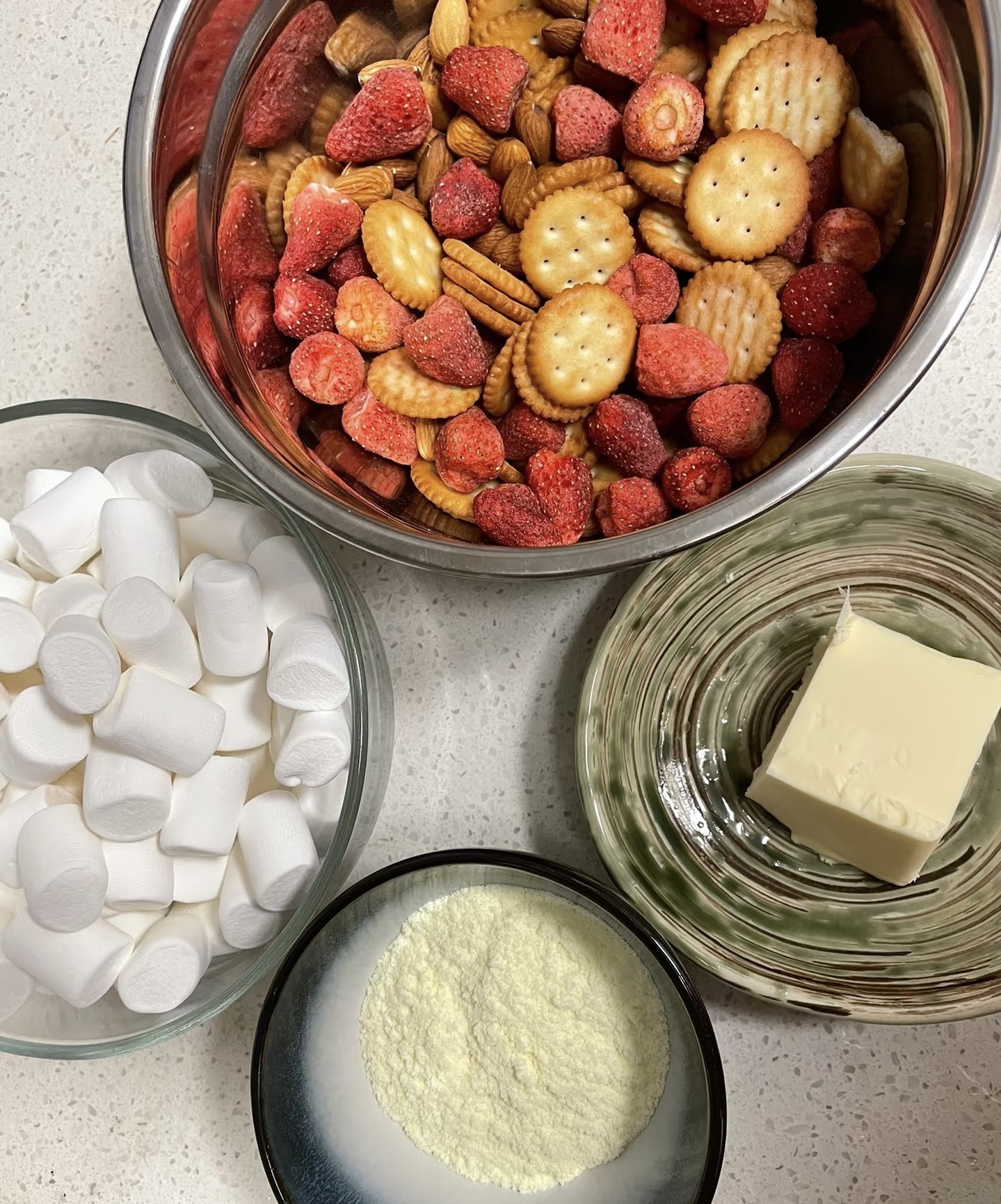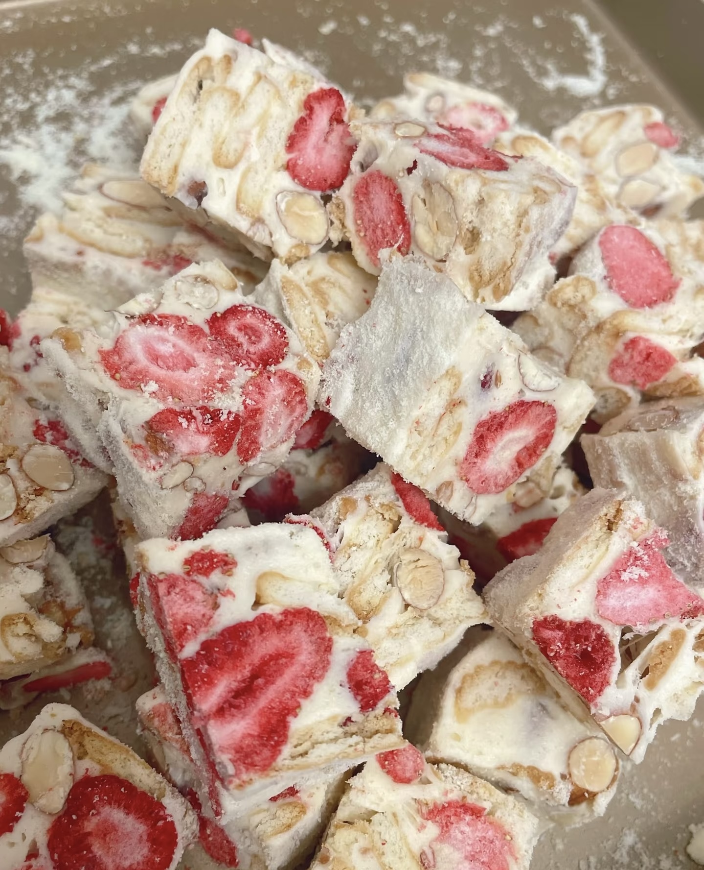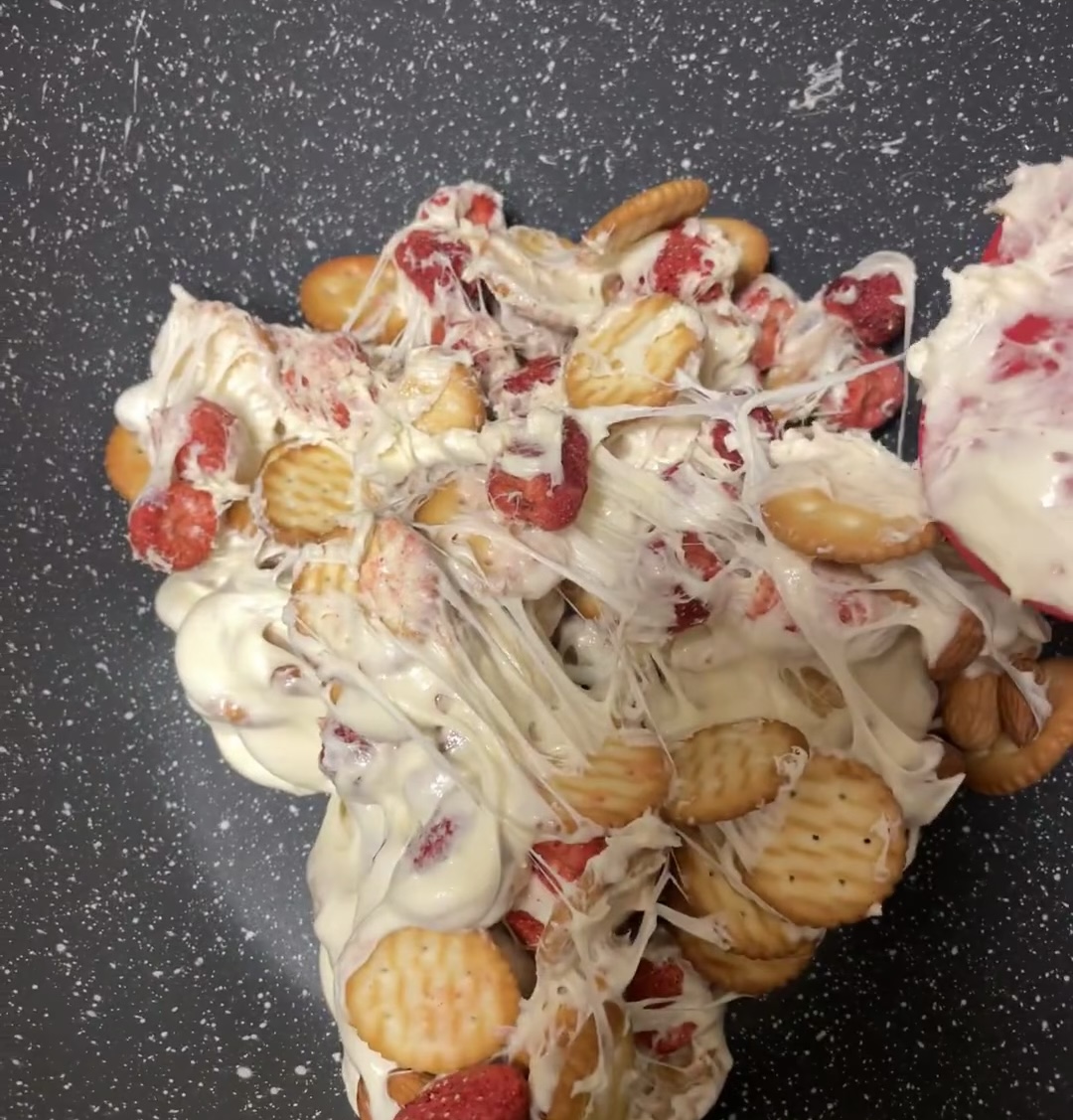 棉花糖处理好后,迅速倒入75克全脂奶粉,快速搅拌至奶粉与棉花糖融合,看不到干粉为止。随后,将255克小饼干、110克坚果和110克冻干草莓混合倒入锅中,用铲子反复翻、压拌。这时你会发现棉花糖开始拉丝,各种材料在棉花糖的“怀抱”里逐渐融合。