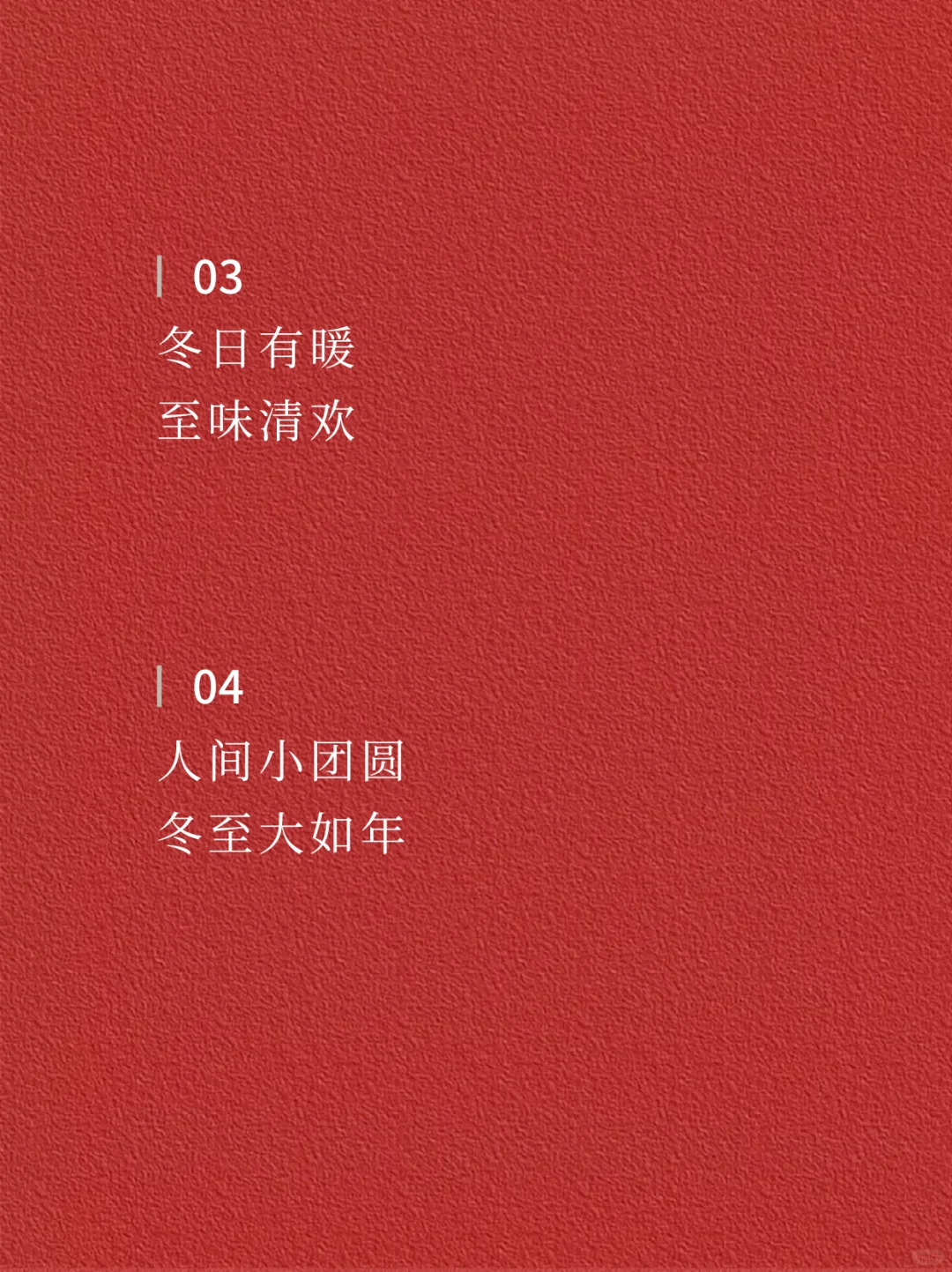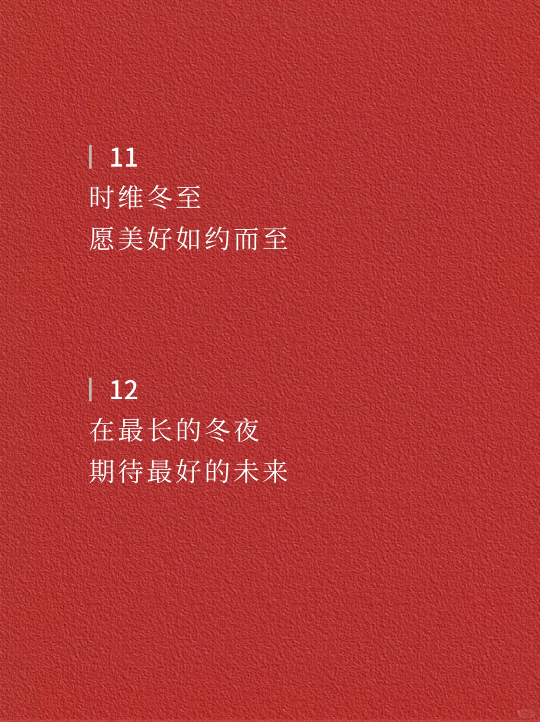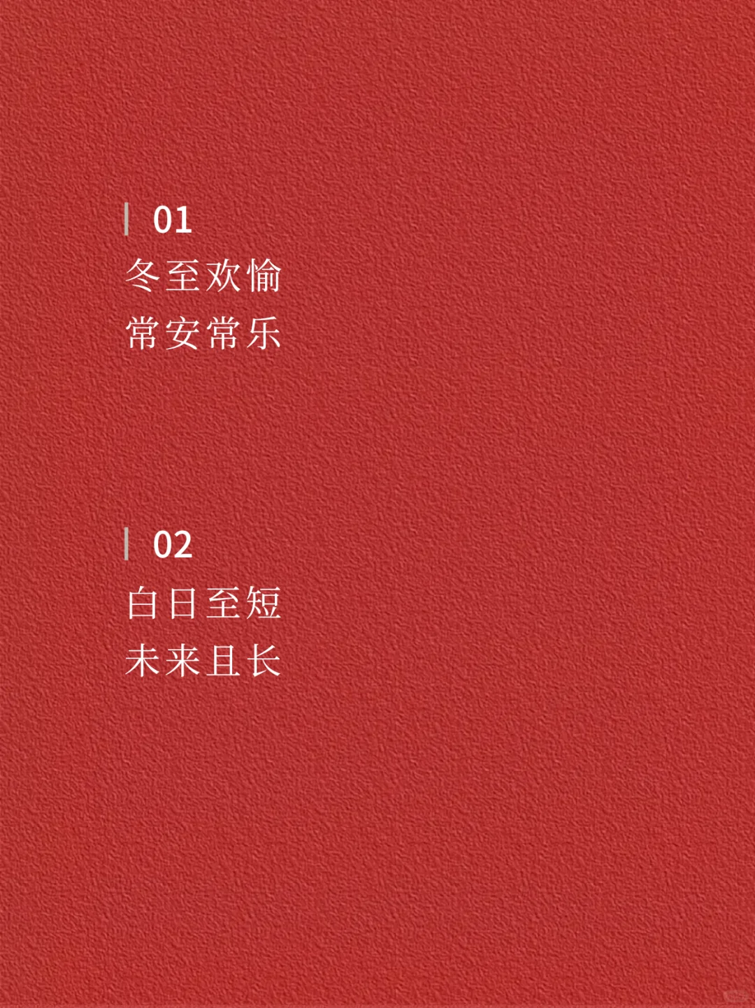 ☃️☃️ 01 冬至欢愉 常安常乐 · 02 白日至短 未来且长 · 03 冬日有暖 至味清欢 · 04 人间小团圆 冬至大如年 · 05 冬至,岁晚 以时雪祈愿,万事顺安 · 06 在最长的冬夜里 等春的照面 · 07 一碗人间烟火 尝遍冷冬下的暖意 · 08 冬至 围炉听雪,共谈风月 · 09 晓云舒瑞 寒影初回长日至 · 10 寒极心向暖 且待春风来 · 11 时维冬至 愿美好如约而至 · 12 在最长的冬夜 期待最好的未来 · ✨✨ —The end— 🌈感谢阅读