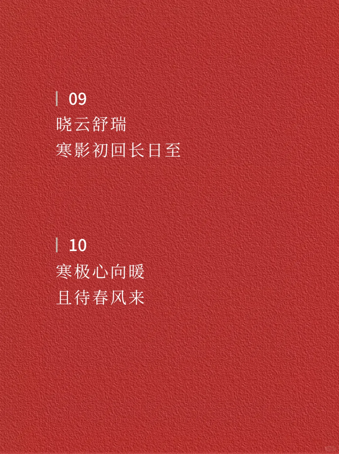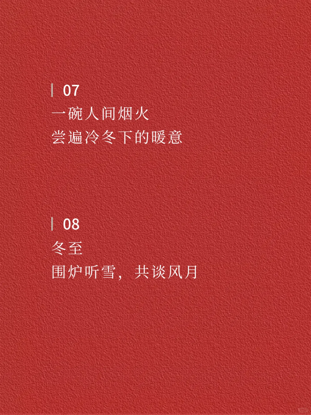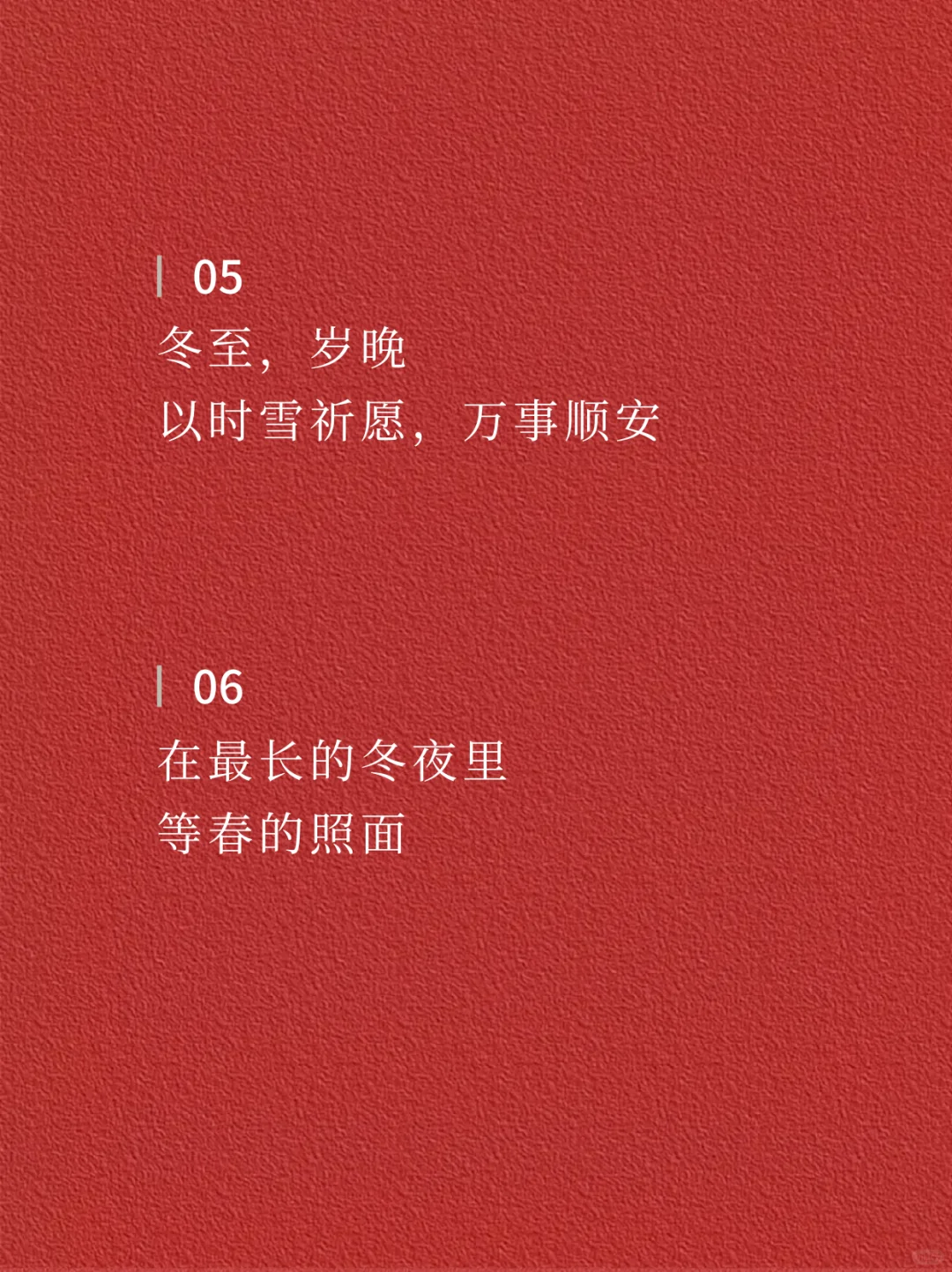 ☃️☃️ 01 冬至欢愉 常安常乐 · 02 白日至短 未来且长 · 03 冬日有暖 至味清欢 · 04 人间小团圆 冬至大如年 · 05 冬至,岁晚 以时雪祈愿,万事顺安 · 06 在最长的冬夜里 等春的照面 · 07 一碗人间烟火 尝遍冷冬下的暖意 · 08 冬至 围炉听雪,共谈风月 · 09 晓云舒瑞 寒影初回长日至 · 10 寒极心向暖 且待春风来 · 11 时维冬至 愿美好如约而至 · 12 在最长的冬夜 期待最好的未来 · ✨✨ —The end— 🌈感谢阅读