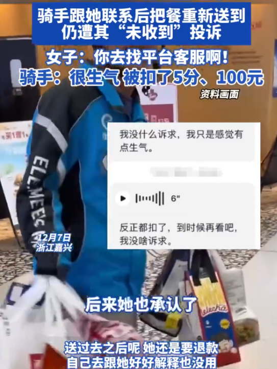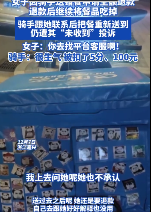 浙江嘉兴,一外卖小哥发现给一女顾客送错了餐,连忙重新配送,岂料,女顾客不仅把两份餐都吃掉了,还依旧以“未收到餐”为由向平台投诉,小哥因此被扣5分,罚款100元,事后,小哥前往女顾客公司讨说法,然而对方一副无所谓的表示:“你去找平台客服啊!”最终,外卖小哥仅用了一招,就让女顾客在全网身败名裂! 对于“阎王好过,小鬼难缠”这句俗语,年仅18岁的外卖小哥陈强是深有体会。 今年早些时候,陈强正式步入社会,没有什么文化的他选择披上一层“黄袍”,在一家配送站当起了一名外卖小哥。 他起初信心满满,相信靠自己勤劳的双手双脚,一定能够发家致富,然而不久之后,他就被现实给上了一课。 在配送站里,陈强要接受站长的管辖,和他周旋,一旦今日没有完成配送任务,便会被站长想方设法的扣钱,不过只要完成配送任务,站长也不会刻意为难他,如实发放工资。 但如果在配送途中遇到难缠的顾客,陈强不仅要被平台扣分,甚至还要被扣钱,有时候,顾客的一条投诉,陈强一天都要白干! 因此,为了避免与顾客发生纠纷,陈强在配送中打起了十二分的精神,防止出现差错。 可陈强毕竟也是一位普通人,难免会出现“送错餐”等一系列差错,好巧不巧的是,近期在一次不慎送错餐后,陈强遇到了一位难缠的女顾客。 当天,他前往一家公司送完餐后,还没离开,这位女顾客便给他打过来电话,说她送错餐了。 陈强一看保温箱,发现这位女顾客的餐还在里面,而将要为下一位顾客送的餐,却不翼而飞。 见此一幕,陈强立刻拿着这份餐折返回公司,可为时已晚,女顾客已经把下一位顾客的餐拆开了。 在这样的情况下,陈强肯定无法为下一位顾客送餐,最为正确的处理方法,是先稳住这位女顾客,再给下一位顾客说明情况,及时止损。 后来,他把原有的餐如实送给女顾客,又给下一位顾客打过去电话,在通话中,对方表示能够理解,陈强只需照价赔偿即可。 陈强听闻此言,心中长舒了一口气,虽然失去了两个小时的收入,但没有收到差评,算是一种比较好的结局。 要知道,一条差评,陈强的账号不仅要被扣分从而导致接单受限,还要被站长扣钱,相当于一天都白干! 然而就当他准备再次踏上外卖征途的时候,意想不到的事情发生了:系统提示他没给顾客如实送餐,对他作出扣5分以及100元罚款的处罚。 陈强一时间感到十分不可思议,他已经跟那位未送到餐的顾客说明情况,对方也表示理解,怎么到头来还是投诉了自己。 陈强万分不爽,后来一看系统通知,投诉者竟然并不是未送到餐的顾客,而是那位未送到餐的女顾客。 这让他感到极度不可思议,明明已经送到餐了,却遭到了对方的投诉。 同时根据平台的规定,用户在投诉“未送餐”成功后,会照价退还餐费,加上另一份送错的餐,相当于女顾客一人没有花一分钱,吃了两份餐。 而陈强就要倒霉许多,扣分又扣钱,回去以后八成还要挨站长的吵。 越想越气的他决定去向女顾客讨一个说法,可又令人意想不到的是,等他找上门后,女顾客正在享用他送错的餐。 同时,面对他的质问,女顾客竟然一副无所谓样子,表示陈强找她没用,要找就去找平台。 陈强听后也不惯着对方,果断把此事曝光至网上,希望网友们能给自己讨一个公道。 而此事经过爆料后,很快便在网上引起热议,不少网友表示,涉事女顾客不能拿了两份餐,还投诉陈强,要求平台退款,这行为相当于白嫖。 不过也有网友表示,投诉是顾客的权利,女顾客没有及时收到餐,自然有权进行投诉,维护自己的合法权益。 对此,你有什么看法? 信息来源: 原文登载于河北长城网在2024年12月9日关于《#女子因骑手送错餐申请退款后将餐品吃掉#》的报道。