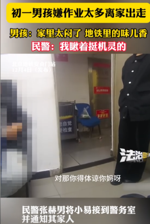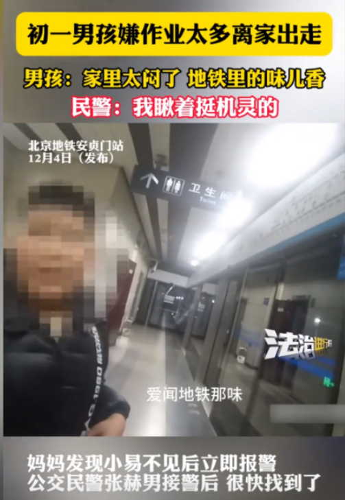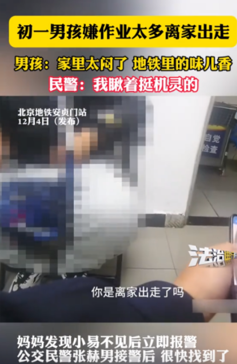 12月4日,北京一初一男孩嫌作业太多与母亲闹脾气离家出走,到地铁散心。母亲发现孩子不见后立即报警。民警接警后迅速展开查找,随后在地铁安贞门站找到男孩。男孩说:“家里太闷了,感觉有味儿!”“地铁那味儿香我觉得!” 事情的起因是这名男孩觉得作业太多,难以应付。这种压力积累到一定程度后,终于在与母亲的一次争执中爆发。 男孩没有选择与父母沟通,而是默默地离开了家。 他的目的地是地铁站,一个充满陌生人和喧嚣的公共场所。 在他看来,地铁站的氛围反而比家里更加舒适。这种想法虽然令人惊讶,却也反映出当代青少年内心的某些困扰。 男孩的母亲发现儿子不见后,立即陷入了极度的焦虑和恐慌中。她迅速做出了报警的决定,希望能尽快找到自己的孩子。 这个决定既体现了母亲的理智,也显示出她对孩子安全的深切关注。警方接到报警后,立即展开了搜寻行动。最终,在地铁安贞门站找到了独自一人的男孩。 警方的快速反应和专业处理值得称赞。民警张赫男在找到男孩后,没有简单地批评教育,而是首先安抚了男孩的情绪,将他带到警务室。 在等待家人到来的过程中,张警官耐心地与男孩交谈,了解他离家出走的原因,并给予适当的劝导。 这种温和而专业的处理方式,不仅化解了男孩的抵触情绪,也为后续的家庭沟通创造了良好的条件。 这起事件迅速在网络上引发热议。许多网友表示理解男孩的压力,同时也对现今教育制度提出了质疑。有网友评论道:"现在的孩子学习压力太大了,连散心的时间都没有。" 另一位网友则说:"家长和学校都应该重新考虑如何平衡学习和生活。"还有人指出:"不仅是作业多少的问题,更重要的是要建立良好的亲子沟通。" 家长在这个过程中扮演着关键角色。他们需要学会倾听孩子的声音,理解孩子的需求。同时,家长也应该帮助孩子建立正确的学习观念,教导他们如何合理安排时间,平衡学习和生活。此外,家长还需要学会控制自己的期望,避免给孩子造成不必要的压力。 对于青少年来说,学会表达自己的感受和需求同样重要。他们应该勇于与父母、老师沟通,而不是采取极端的方式来逃避问题。同时,培养良好的时间管理能力和压力管理技巧,也能帮助他们更好地应对学业压力。 社会各界也应该为解决这个问题贡献力量。心理健康专家可以为学校和家庭提供专业的指导,帮助他们更好地理解和处理青少年的心理问题。媒体则可以通过正面报道,传播科学的教育理念,引导公众形成理性、健康的教育观。 回到这个具体事件,我们可以看到,虽然起因是一次家庭矛盾,但它却折射出了更深层次的社会问题。这个男孩的行为,某种程度上是对当前教育体系和家庭教育方式的一种无声抗议。而母亲的焦急和警方的快速反应,则体现了社会对青少年安全的高度重视。 这个事件的圆满解决,得益于警方的专业处理和家人的理解。然而,我们不能就此认为问题已经得到了彻底解决。相反,这应该成为我们反思和改进的起点。我们需要思考,如何才能真正建立一个既能保证教育质量,又能照顾到学生身心健康的教育体系?如何在繁忙的现代生活中,维系良好的家庭关系,建立有效的亲子沟通? 这个看似普通的事件,实际上触及了教育、家庭、社会等多个层面的深层问题。它提醒我们,在追求社会进步的过程中,不能忽视每个个体的感受和需求。只有真正关注到每个人的幸福感,我们的社会才能实现真正的进步和发展。 信源:法治进行时