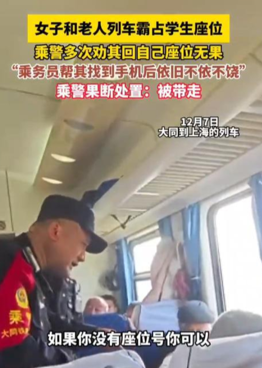 12月7日,大同开往上海的绿皮火车,本该是寻常的旅途,却因一起霸座事件,演变成了一场荒诞的闹剧。一位女子,带着一位老人,硬生生将两位女学生的座位据为己有,这出闹剧最终以警方的介入而告终。