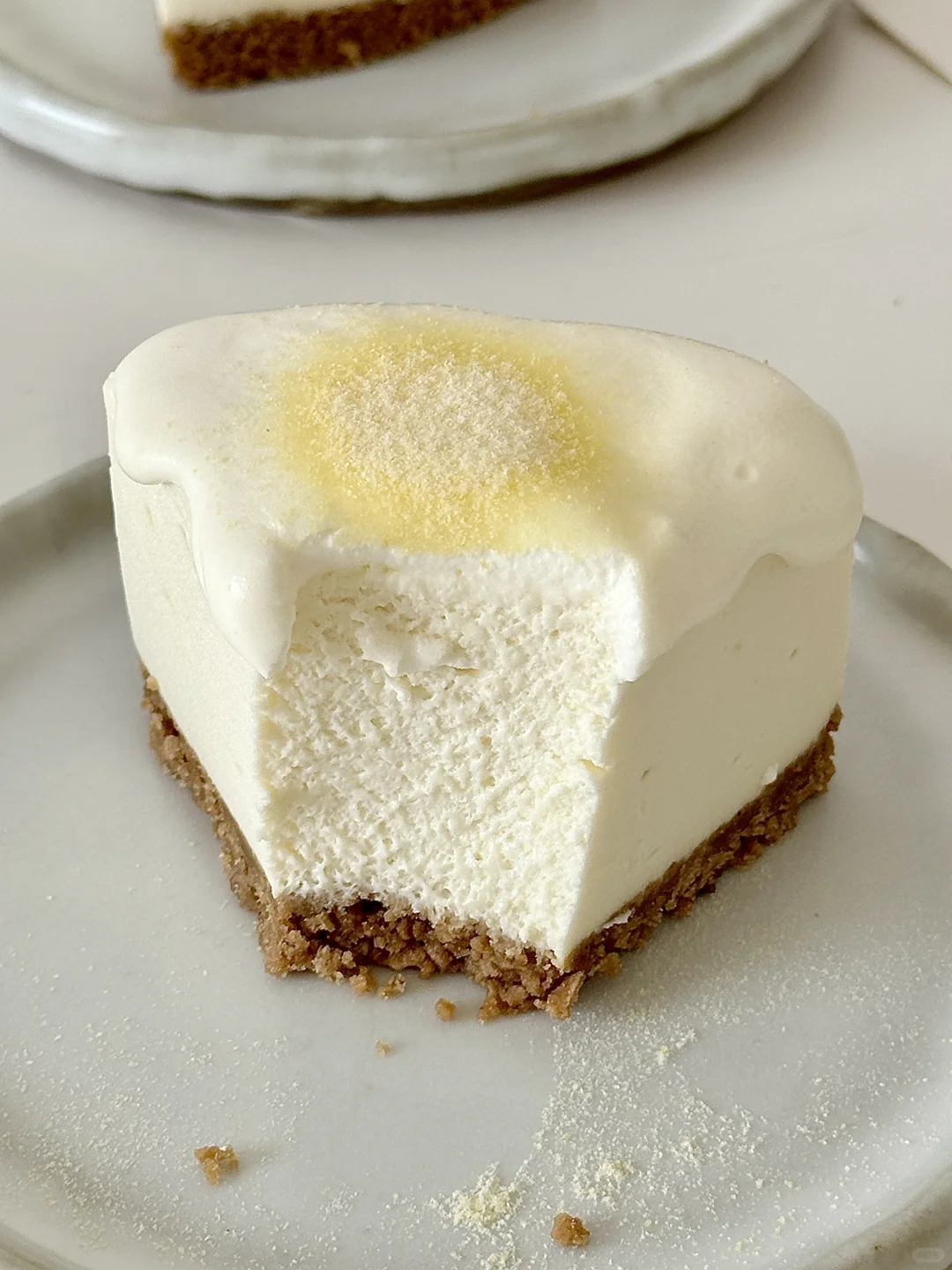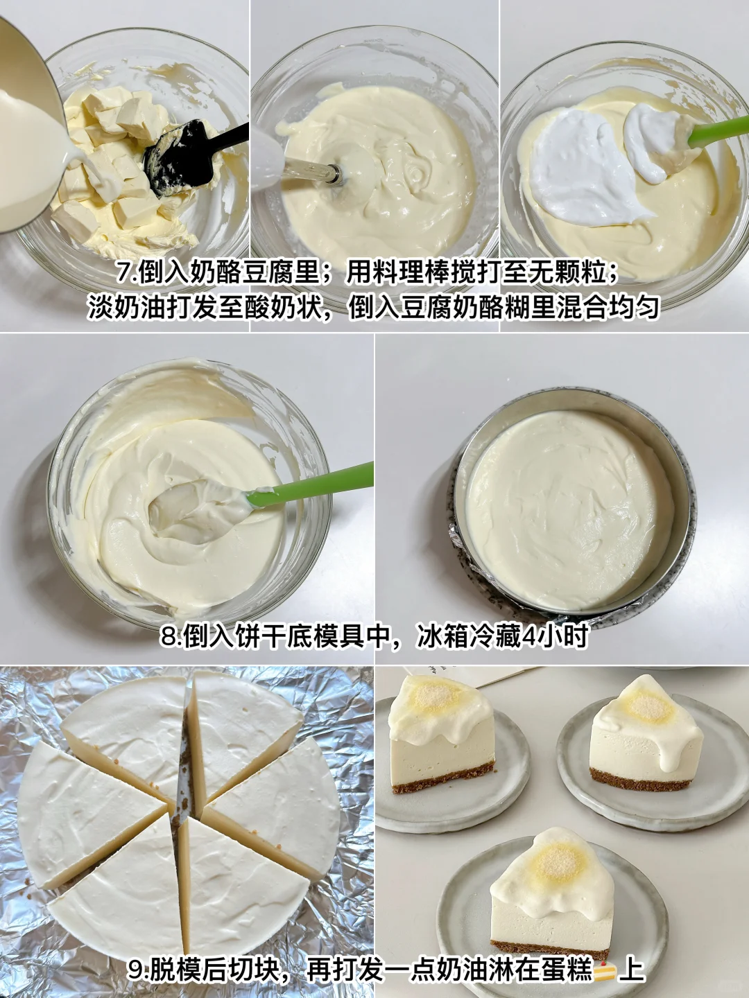 ❺淡奶油打发酸奶状,倒入豆腐奶酪糊里混合,然后倒入饼干底模具,入冰箱冷藏4小时