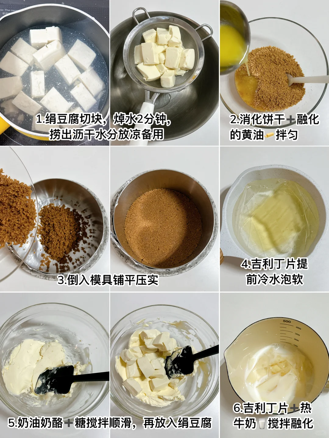 ❸奶油奶酪➕糖搅拌顺滑,再倒入绢豆腐