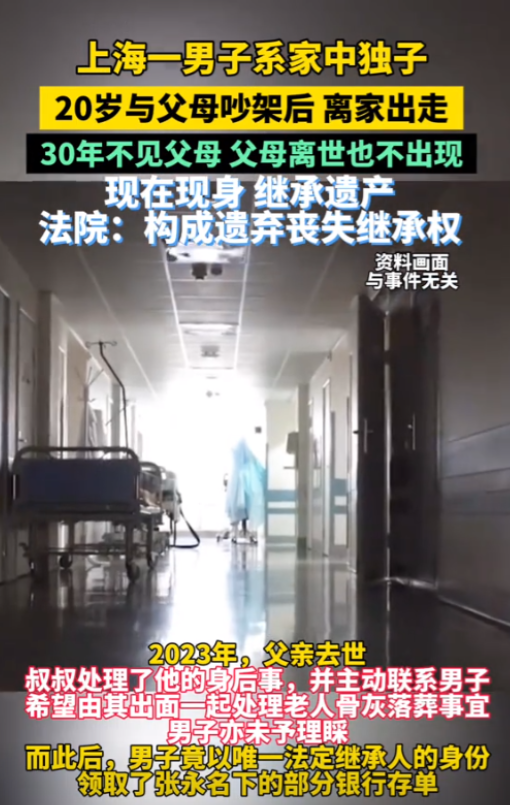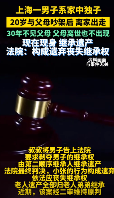 上海,夫妻俩养一独生子,不曾想,儿子20岁时叛逆,和父母大吵一架,离家出走,夫妻俩找了30多年,母亲去世后,父亲申请宣告儿子死亡,不料,儿子突然出现,父亲临终,儿子仍拒绝相见,甚至不曾参加父亲的葬礼。然而,他却在葬礼后现身领取父亲遗产,见此,叔叔直接将侄子告上法庭,要求剥夺他的继承权!法院判决让人没想到。 1990年的那个夏天,陈家的争吵声震惊了整个小区。20岁的陈强(化名)怒气冲冲地冲出家门,留下目瞪口呆的父母陈建国(化名)和王晓丽(化名)。这一别竟是三十多年。 这场争吵源于陈强决定放弃大学学业,追求自己的音乐梦想。陈建国坚持认为稳定的工作才是人生正途,而陈强则固执地认为父母不理解他的追求。 接下来的30多年,陈建国和王晓丽夫妇四处奔波,在每个可能的地方寻找陈强的踪迹。他们在派出所报案,在街头张贴寻人启事,甚至求助于电视台的寻人栏目。 每逢春节、中秋,他们都会守在家中,期盼着儿子能回来团聚。然而,年复一年,希望逐渐变成了绝望。 2015年,王晓丽因病去世。临终前,她仍然念叨着儿子的名字。陈建国独自一人面对空荡荡的家,心如刀割。在经历了漫长的等待和痛苦后,他最终决定申请宣告儿子死亡。 就在法律程序即将完成时,命运却给了他一记重击。 陈强突然出现在了上海,但他并未回家。他只是通过律师联系了父亲,表示自己还活着,但不愿相见。陈建国试图通过各种方式与陈强沟通,但都被拒绝了。 2020年,陈建国病重住院。即便在生命的最后时刻,陈强仍然拒绝见父亲最后一面。陈建国带着遗憾和心痛离开了人世。更令人震惊的是,陈强甚至没有参加父亲的葬礼。 然而,就在葬礼结束后不久,陈强却突然现身,要求领取父亲的遗产。这一举动彻底激怒了陈国平,陈强的叔叔。陈国平无法接受这个“不孝子”还能继承遗产,于是毅然决定将侄子告上法庭,要求剥夺他的继承权。 法庭上,双方展开了激烈的辩论。陈国平的律师强调,陈强多年来对父母不闻不问,甚至在父亲临终和葬礼时都不愿现身,这种行为已经严重违背了孝道和道德。他们引用《民法典》中关于继承权的相关条款,认为陈强的行为已经构成了“对被继承人有重大侮辱或者虐待行为”。 陈强的律师则辩称,虽然陈强与父母长期疏远,但这源于年轻时的误解和价值观冲突,并不构成法律意义上的遗弃。他们强调,陈强这些年一直在国外打拼,虽然没有与父母联系,但也没有做出任何伤害父母的行为。 法庭还邀请了心理学专家作为证人。专家分析了离家青年的心理状态,指出家庭矛盾和沟通不畅可能导致长期的疏离感。他们认为,陈强的行为可能源于自我身份探索和独立意识,以及社会压力与个人理想的冲突。 这个案件在社交媒体上引发了热议。 不同年龄群体对此有截然不同的看法。年轻人中有人同情陈强追求梦想的决心,认为父母应该尊重子女的选择。而老一辈则普遍认为陈强的行为太过自私,违背了传统的孝道观念。 经过慎重考虑,法院最终做出了令人意外的判决:剥夺陈强的继承权。 法官在判决书中指出,虽然法律保护公民的继承权,但继承权也应建立在基本的亲情和道德基础之上。陈强长期不与父母联系,在父亲临终和葬礼时的冷漠态度,已经严重违背了社会道德和家庭伦理。 这个判决在社会上引起了广泛的讨论和反思。它不仅是对陈强个人的警示,也为类似的家庭矛盾敲响了警钟。人们开始思考在现代社会中如何平衡个人追求和家庭责任,如何在代际之间建立有效的沟通。 这个案例深刻揭示了现代家庭关系中的复杂性。它提醒我们,亲情需要双方共同维护,法律虽然可以保护权利,但无法完全替代道德和情感的约束。在追求个人理想的同时,我们也不应忘记家庭的重要性和对亲人的责任。 参考资料:上观新闻——2024-10-09 14:01《30多年未尽任何赡养义务,不孝子被剥夺继承权》