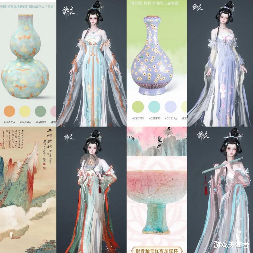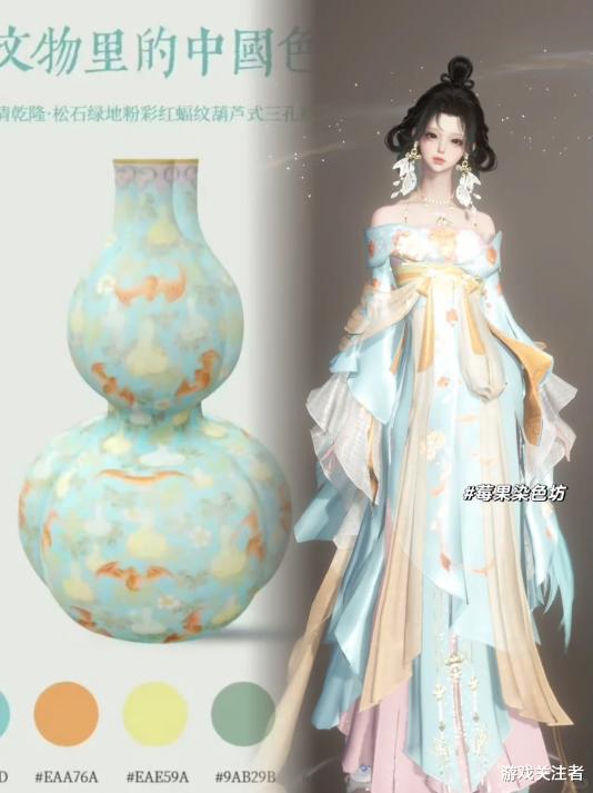 比如说博主@莓果BerryDye原创就参考了清乾隆时期的松石绿地粉彩红蝠纹葫芦式三孔瓶,以低饱和的蓝绿色为底色,缀以浅橙、浅粉的花纹配饰,清新灵动又不失典雅,感觉给眼睛做了一整套眼保健操。