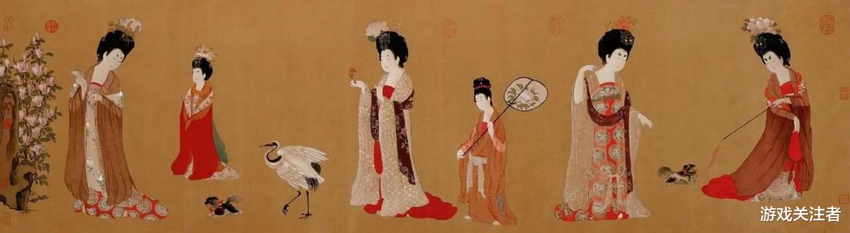 游戏里的古风时装也是参考古代形制精心设计的,最近新出的时装【云锦天香】就是以唐代《簪花仕女图》为灵感,复原了唐代雍容华贵的贵族服饰。