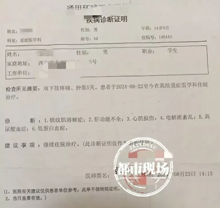 高女士将儿子送到医院检查,检查结果为:横纹肌溶解症,随后被紧急送到重症监护室。