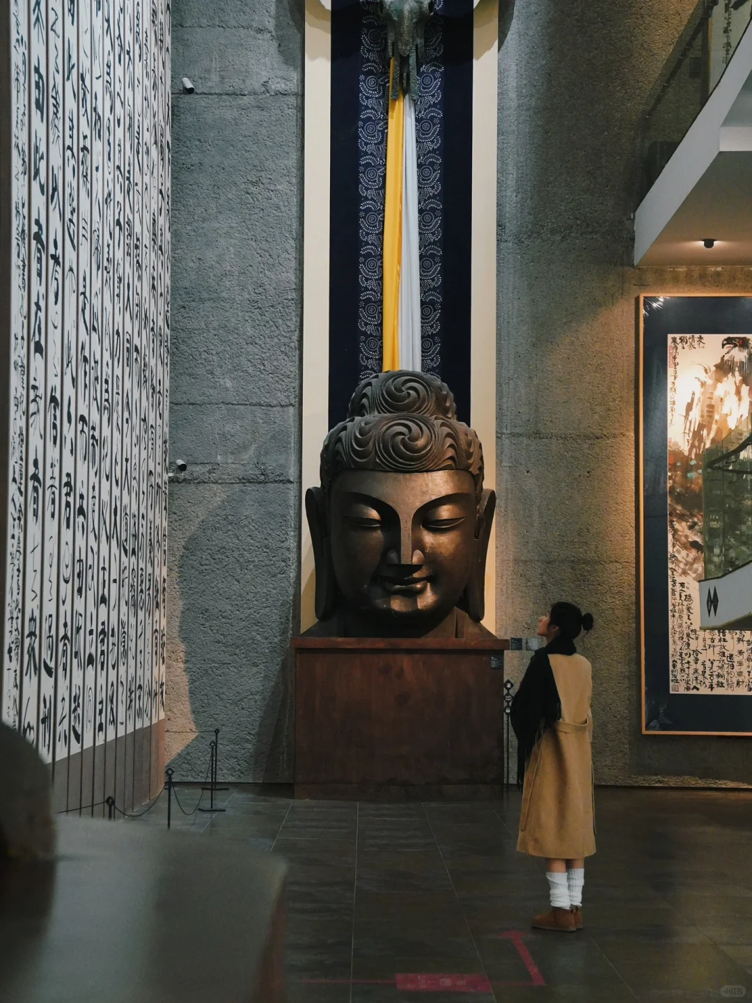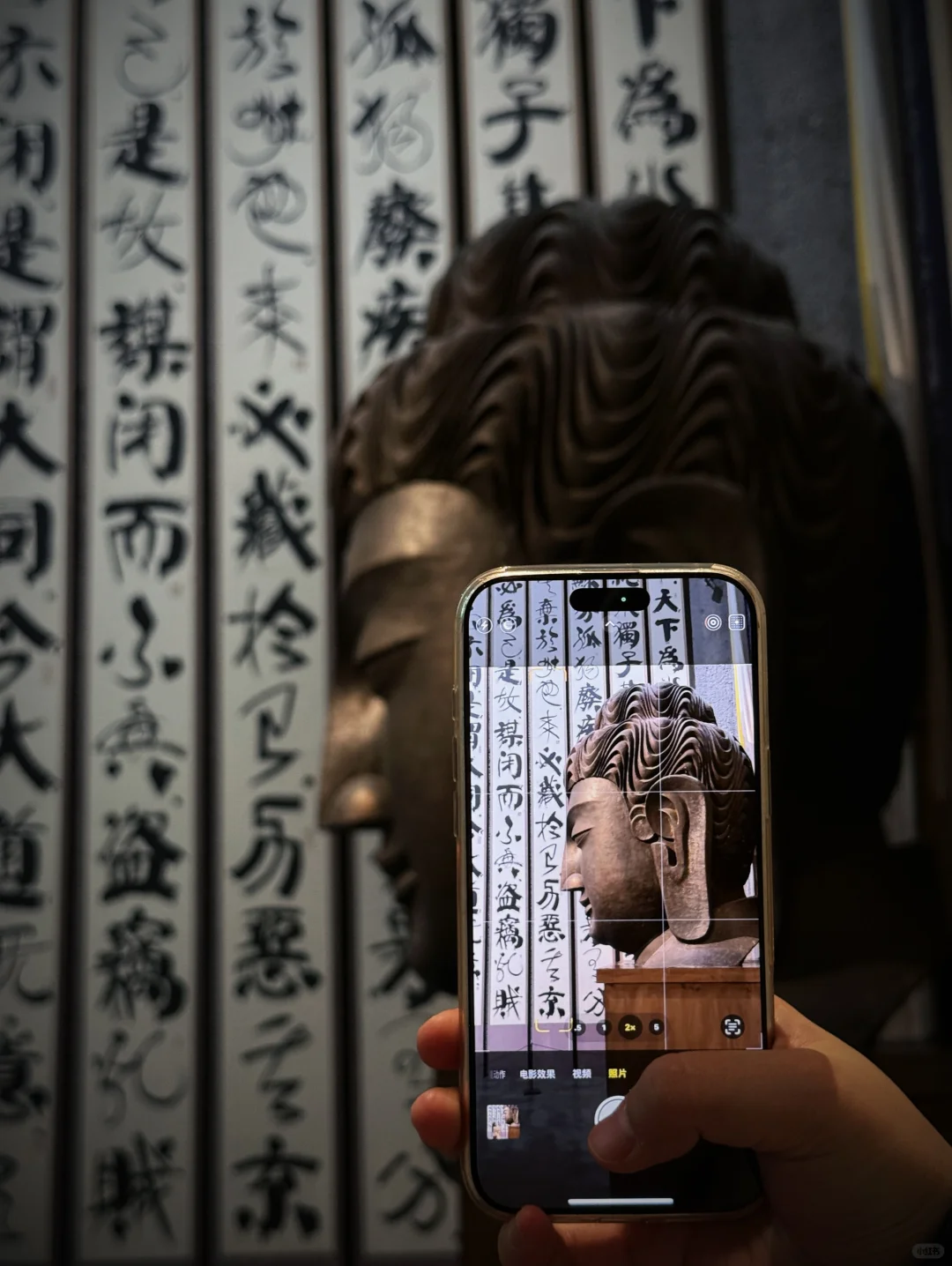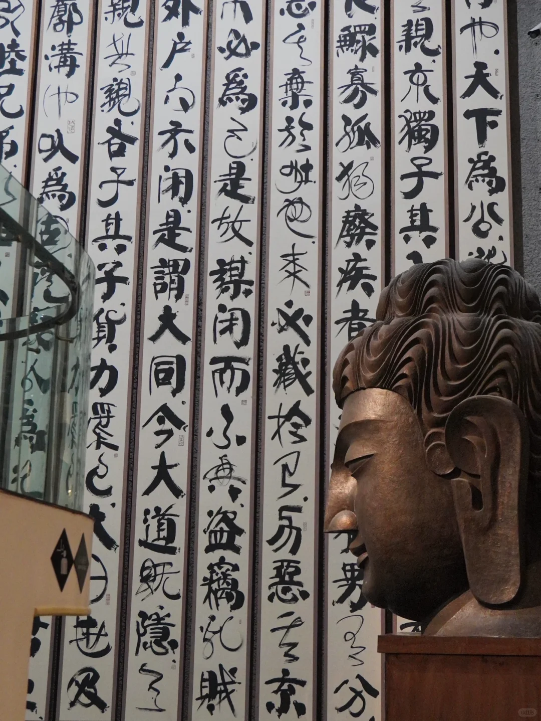 在书法墙旁边,可以在一层取佛像和人像侧面,也可以站在二层玻璃廊道,机位在一层
