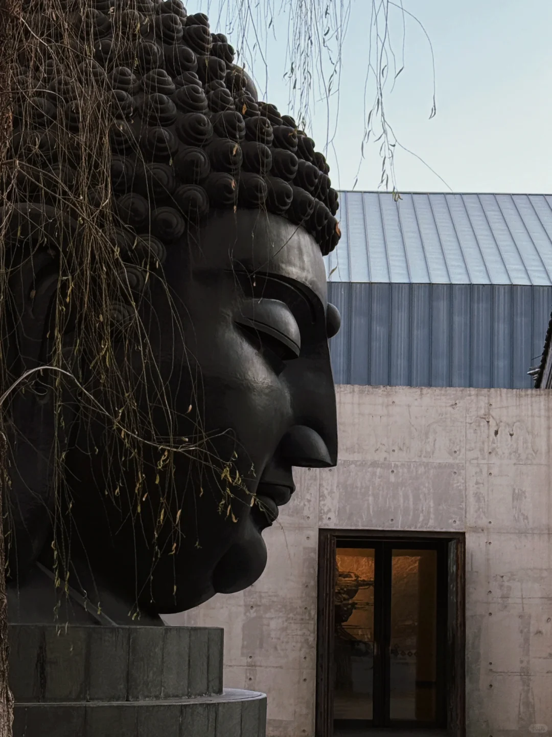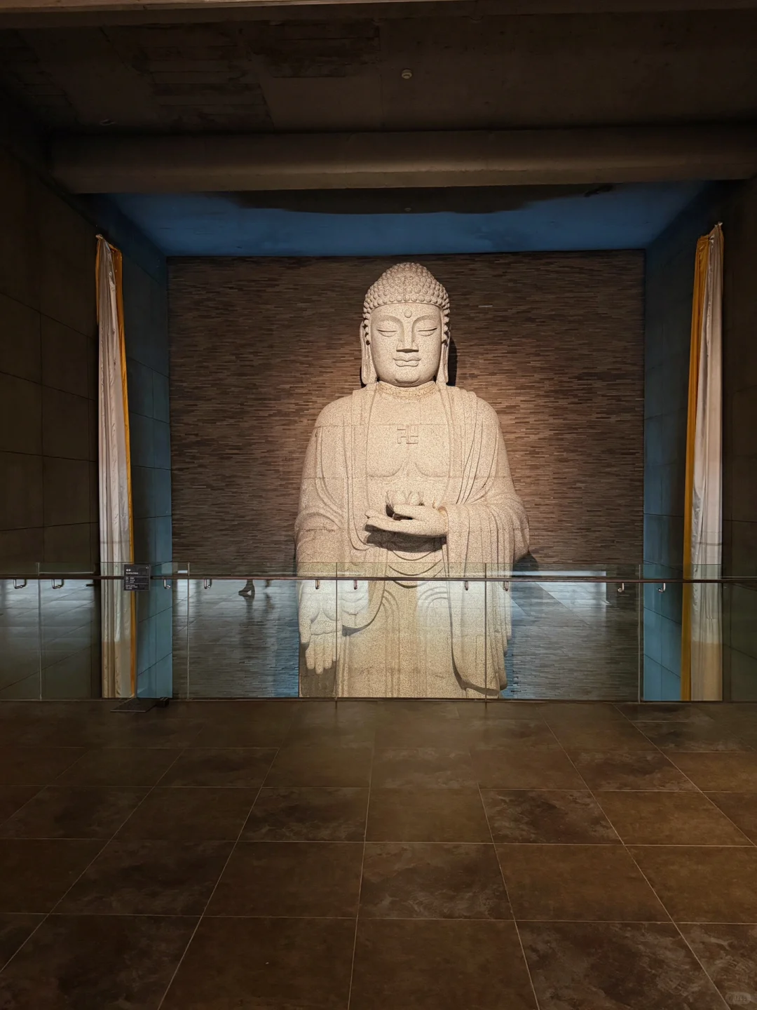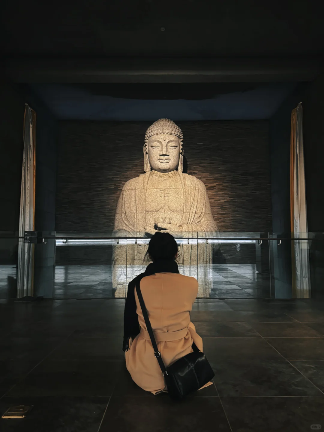 在书法墙旁边,可以在一层取佛像和人像侧面,也可以站在二层玻璃廊道,机位在一层
