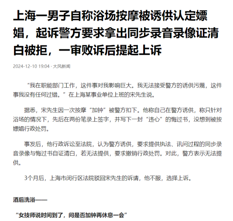 上海金山,男子在事业单位工作,酒后去洗浴中心找了女技师服务,结果被警方认定为嫖娼,并进行了处罚。男子不服,认为警方是诱供,明明说了只是为了搞洗浴中心的,只要承认加钟是为了打飞机,就可以早些回家,结果还是被处罚了。男子不服,起诉到法院,要求警方提供执法视频,但遭到了拒绝,而法院也驳回了男子的诉请。目前,男子正准备上诉。