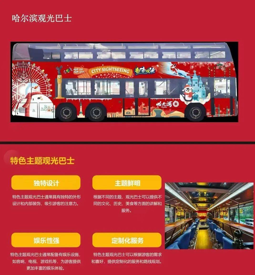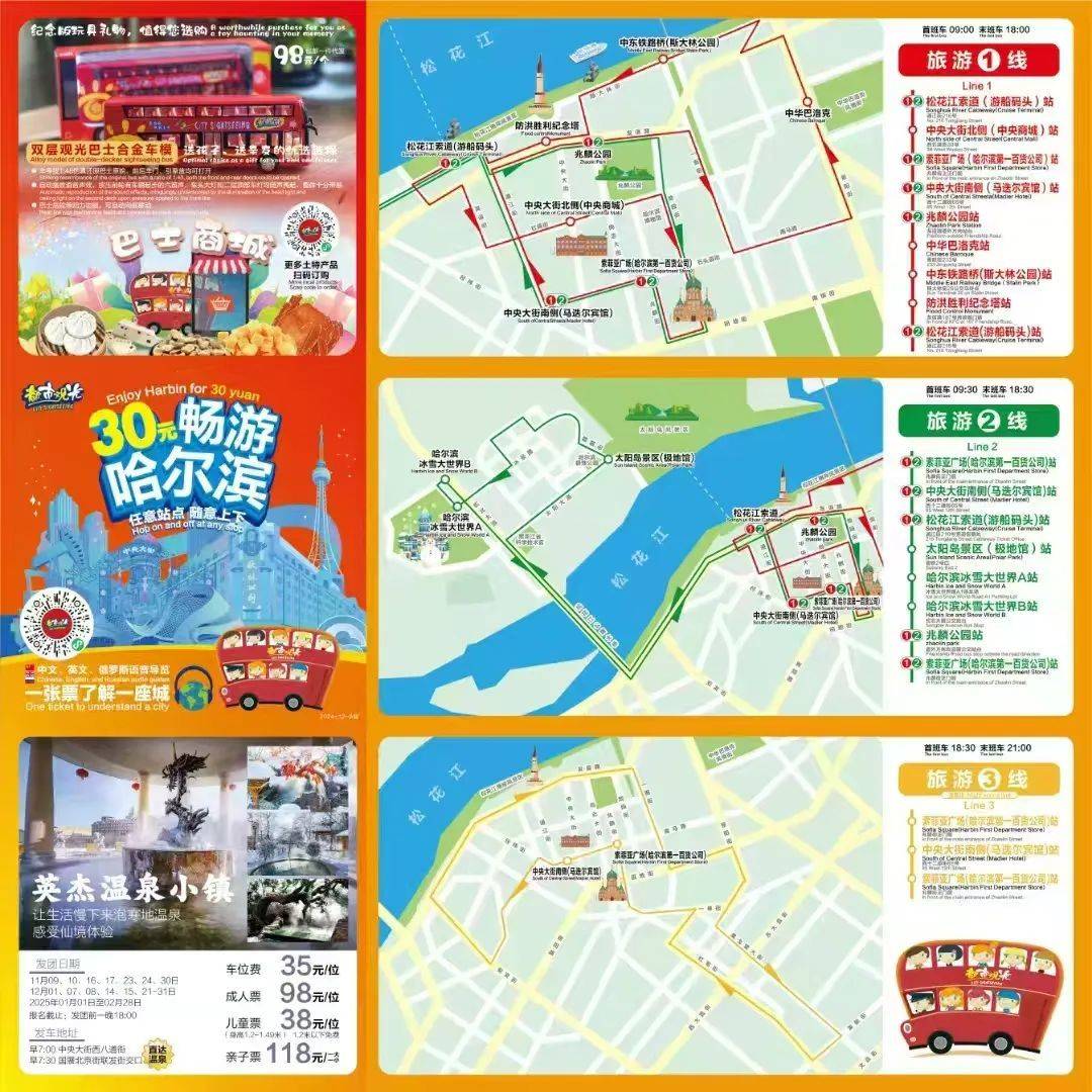哈尔滨观光巴士将运行三条观光路线,分别是围绕哈尔滨城市地标中央大街的旅游1号线;串联冰雪大世界与中央大街的旅游2号线以及夜景线的旅游3号线。三条观光线路分别串联了哈尔滨地标性景点及纪念地,采用一票畅游,24小时内可无限次乘坐,三条线路可任意换乘。