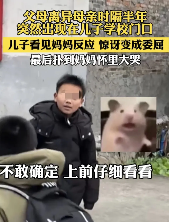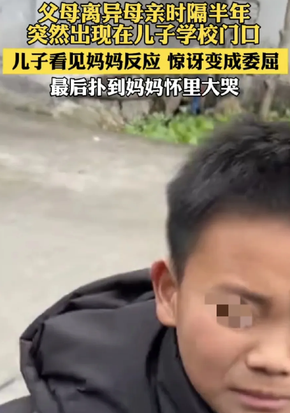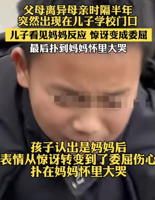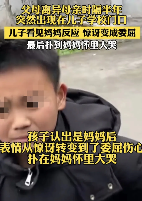 父母离异半年,妈妈突然出现在儿子的学校门,起初儿子还有点不相信是妈妈来接他,可走近一看确定是妈妈后,儿子由不敢相信的惊讶反应,瞬间变得一脸伤心的扑在妈妈怀里大哭了起来,仿佛把这半年的思念和委屈都哭了出来。而妈妈看儿子的如此反应也是心酸不已。