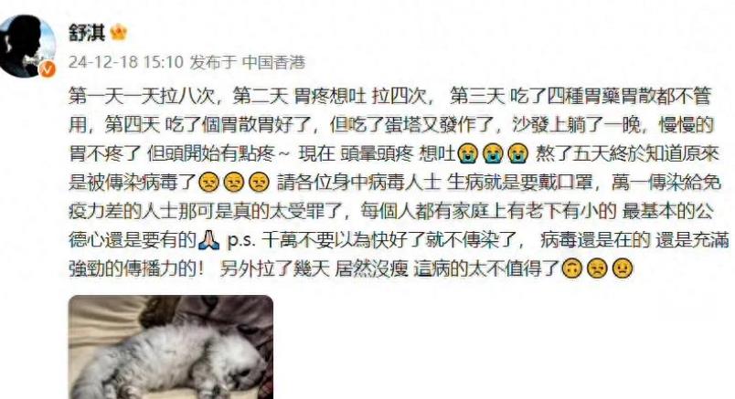 舒淇感染病毒,怒斥传染者没公德心! 舒淇说的对。人,应该有公德心!。 现在人自己有病了就不戴口罩了,都想着反正自己得了,免疫了,不管别人是否会被传染上! 人都是自私的,谁会在意陌生人的死活呢,所以只能自己保护好自己,照顾好家人。