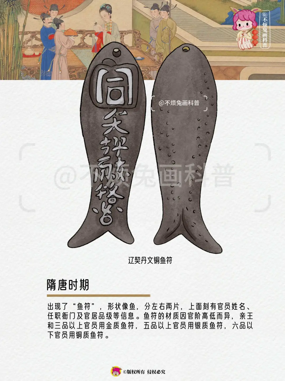 出现了“鱼符”,形状像鱼,分左右两片,上面刻有官员姓名、任职衙门及官居品级等信息。鱼符的材质因官阶高低而异,亲王和三品以上官员用金质鱼符,五品以上官员用银质鱼符,六品以下官员用铜质鱼符。