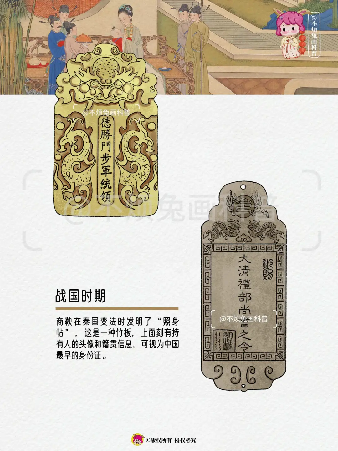 商鞅在秦国变法时发明了“照身帖”,这是一种竹板,上面刻有持有人的头像和籍贯信息,可视为中国最早的身份证。