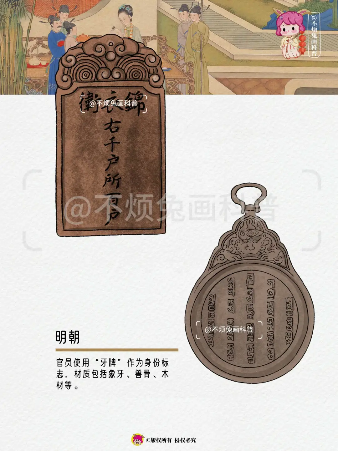 官员使用“牙牌”作为身份标志,材质包括象牙、兽骨、木材等。