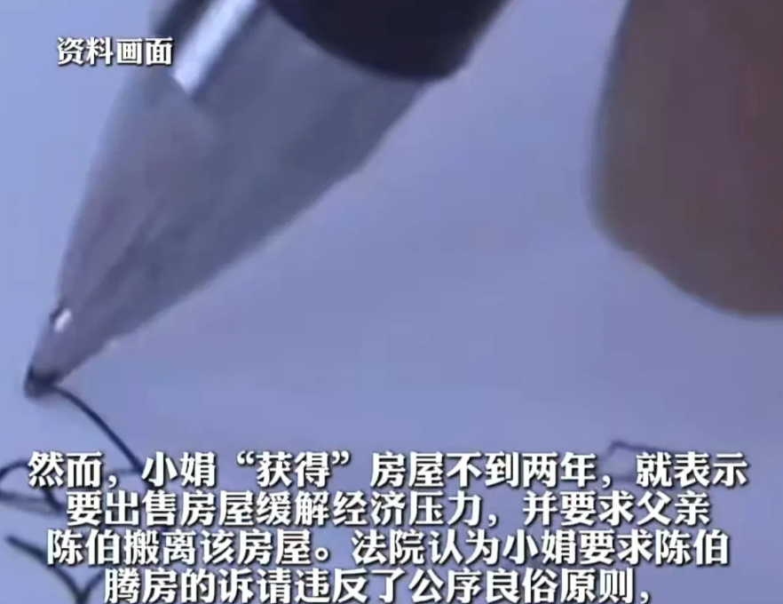 广东广州,大妈挂念在国外生活的女儿,为了让女儿在国内有个落脚地,劝说丈夫和儿子将家里的房子过户给女儿。可女子拿到房子还没2年,就要求父亲从房子里搬出去,她说自己经济压力大,要把房子给卖了。老人傻眼,拒绝搬走,女子一纸诉状,将80多岁的父亲告上了法庭。 (来源:广州天河区人民法院)